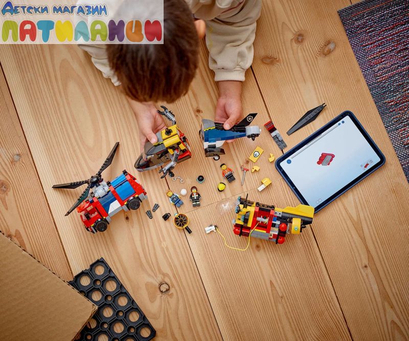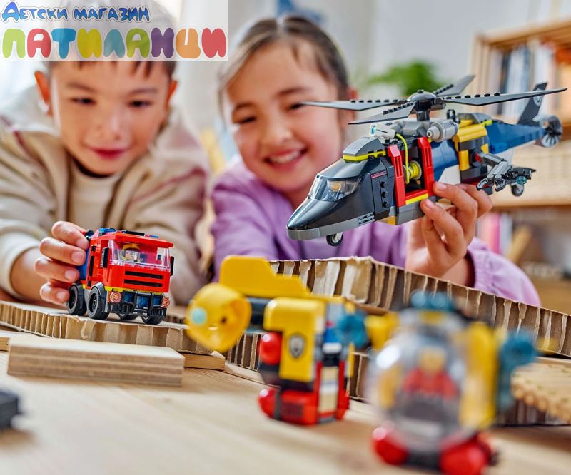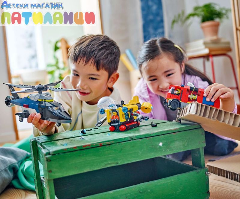 С комплекта LEGO® City Хеликоптер, пожарна кола и подводница – ремикс вълнението е тройно – децата смесват и свързват 3 ексшън играчки в епични творения!