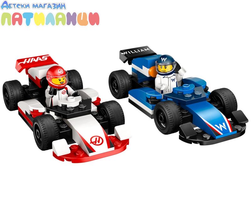Какво има в кутията? – всичко необходимо на децата, за да построят две състезателни коли от Formula 1® с минифигури на пилоти на Williams Racing и Haas;