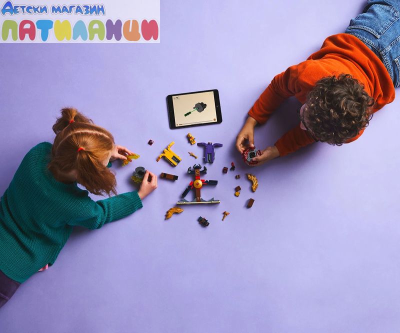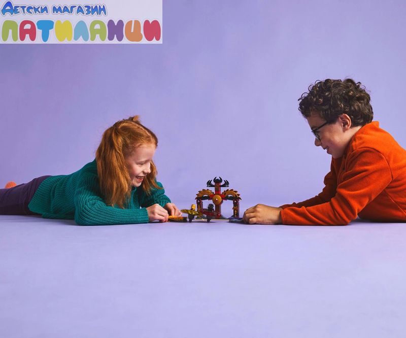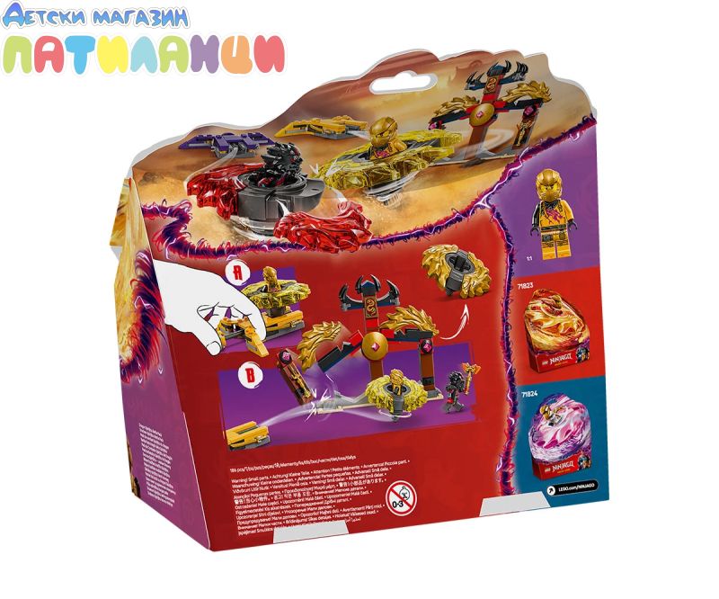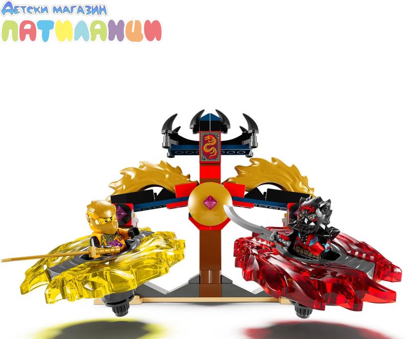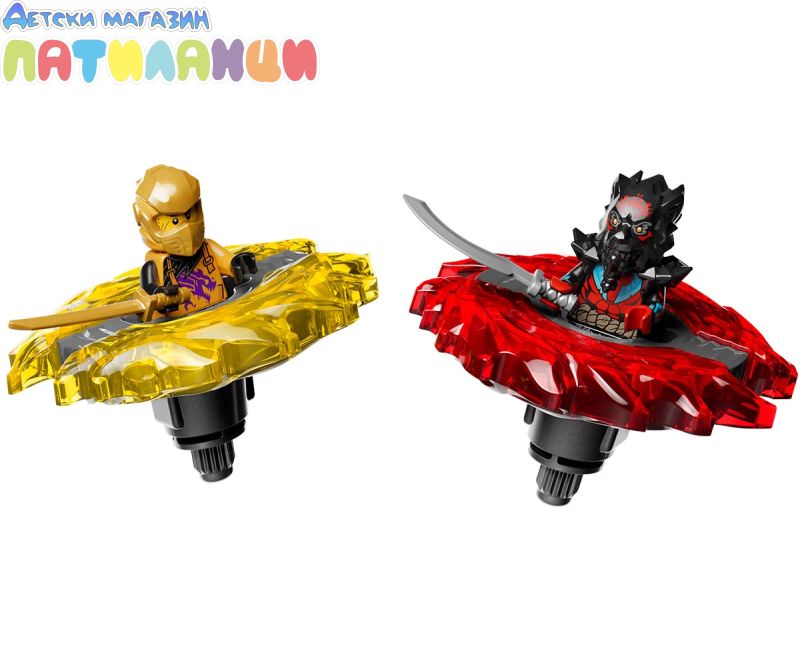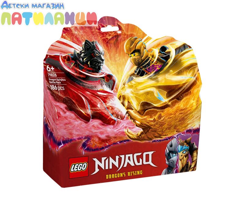 Комплектът с екшън играчки „Боен пакет за драконово спинджицу“ (71826) позволява на момчето и момичето на възраст над 6 години да разиграват невероятен екшън от сезон 3 на ТВ сериала NINJAGO® Dragons Rising. Този малък комплект с ексшън играчки LEGO® включва бойна арена на храма, 2 минифигурки на Арин и Рас и 2 спинери за драконово спинджице, които децата могат да поставят в изстрелващите устройства и да изстрелват във вихрени битки един срещу друг. Децата могат да се насладят на страховити ролеви приключения, докато организират сблъсъци между жълтия спинер на Арин и червения спинер на Рас, които имат свалящи се елементи на силата. Героите от NINJAGO могат да надградят своите спинери със златни елементи, които могат да спечелят, като ударят и срутят бойната арена. Гамата комплекти (продава се отделно) и бойни играчки за конструиране LEGO NINJAGO включват роботи, дракони и храмове, така че феновете да могат да се насладят на нинджа ексшън. Всеки комплект за игра може да бъде създаден с приложението LEGO Builder, което насочва вас и вашето дете в горското и интуитивно строително приключение.