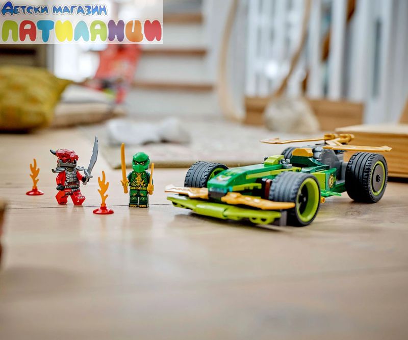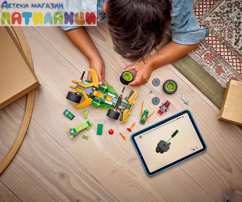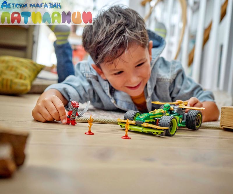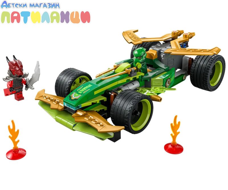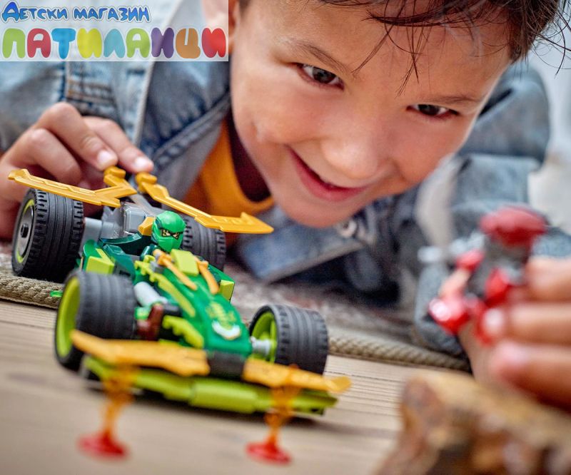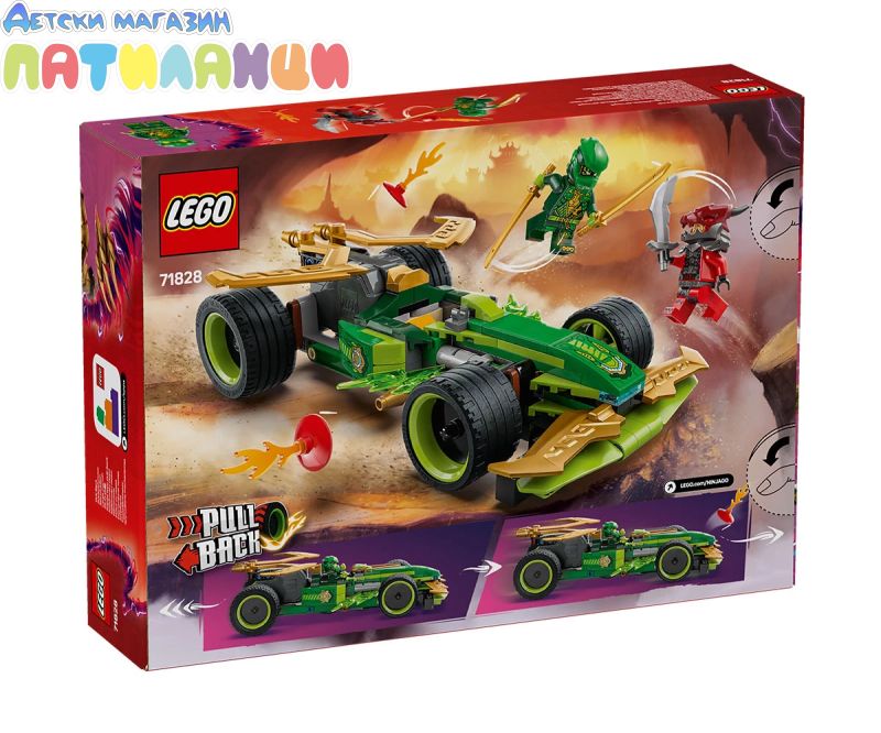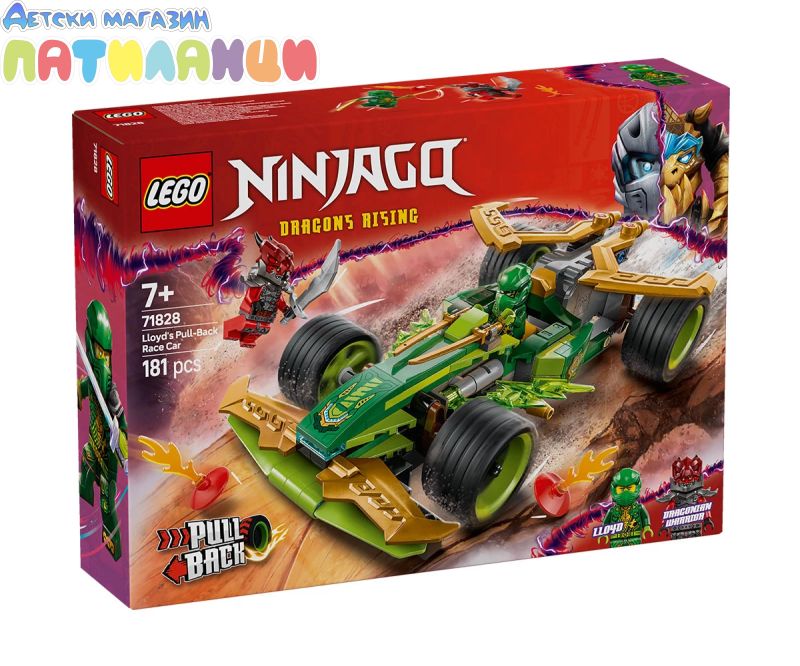 Зарадвайте вашия малък нинджа с първата по рода си състезателна кола NINJAGO®! Момчета и момичета на възраст над 7 години могат да пресъздадат супербърз екшън от сезон 3 на ТВ сериала NINJAGO Dragons Rising със Състезателна кола на Лойд (71828) – изтеглете я назад, освободете я и вижте как се изстрелва напред. Елегантната състезателна кола има 4 гуми, кабина за минифигура и е украсена със зелени мълнии. Строителният комплект за въображаема игра се предлага с 2 минифигури NINJAGO: Лойд с два златни меча катана, и злодейски Драконов воин с меч, за да могат децата да разиграват вълнуващи битки. Строителният комплект включва и 2 светещи елемента за създаване на малка писта с препятствия за състезателната кола. Останалата част от гамата нинджа играчки за конструиране LEGO NINJAGO за деца включва роботи, дракони и храмове, така че феновете да могат да разиграват ролеви екшън със своите нинджа герои (комплектите се продават отделно). Всеки страхотен нинджа комплект за игра може да бъде създаден с приложението LEGO Builder.