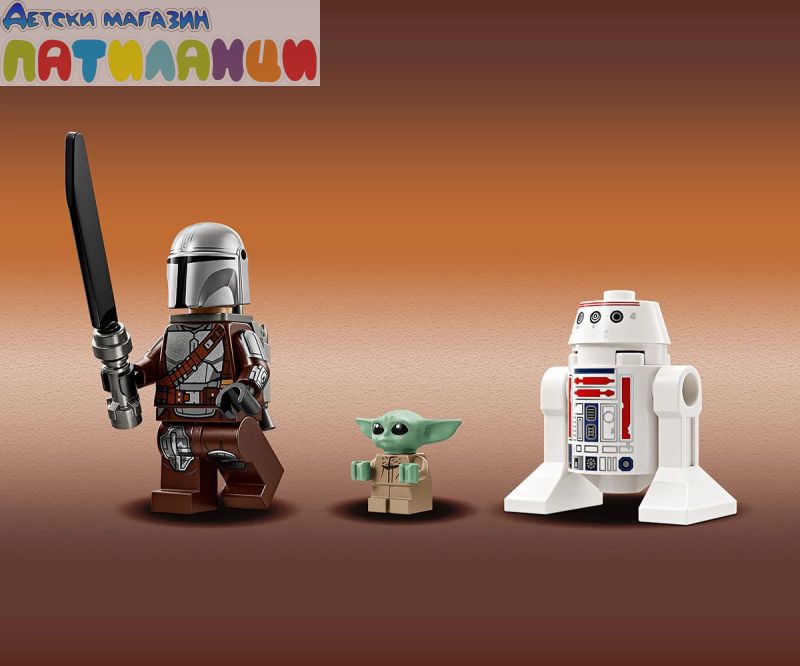 Трима герои LEGO® Star Wars™ – минифигура LEGO на Мандалореца, фигура LEGO на Грогу и фигура LEGO на дроид R5-D4;