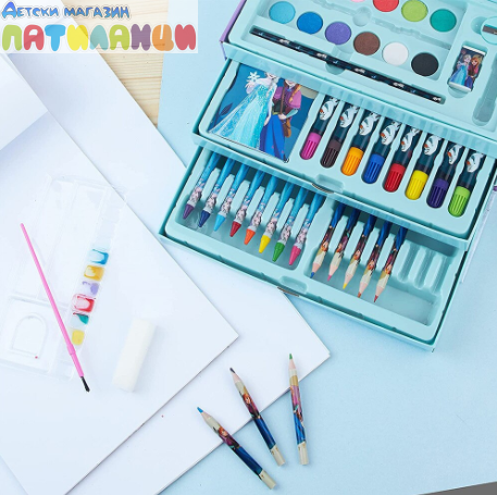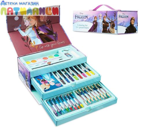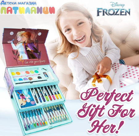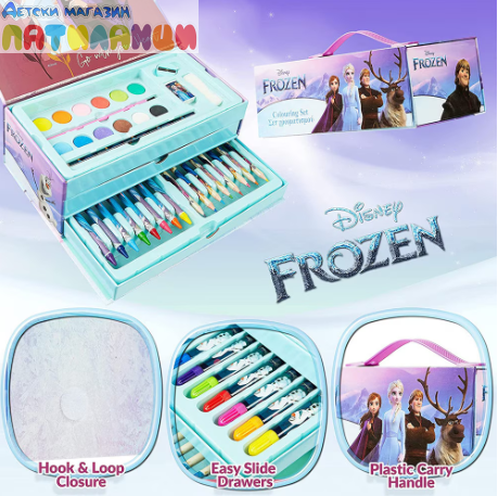 Комплект за оцветяване Frozen Нашият пълен комплект се състои от 52 части, за да дадете на вашето мъниче пълен набор от художник, в който то може да работи върху своята креативност и въображение.