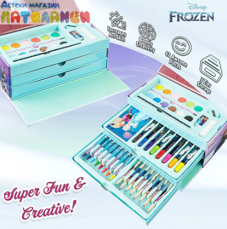 Този комплект за оцветяване Frozen от 52 части е идеалният начин да забавлявате малките си с часове. Предлага се в здрава кутия за инструменти с 3 чекмеджета, този комплект включва всичко, от което детето ви се нуждае, за да разгърне своята креативност, включително бои, химикалки за оцветяване, моливи, гуми и книжка за оцветяване с любимите герои на Frozen . Компактният дизайн на кутията с инструменти го прави лесно за вашето дете да вземе своя комплект за оцветяване със себе си в движение, като гарантира, че винаги има забавна и творческа дейност, която да го занимава. Поръчайте своя днес и подарете въображение