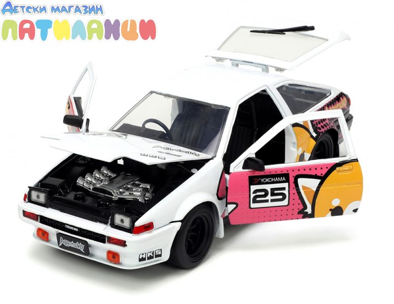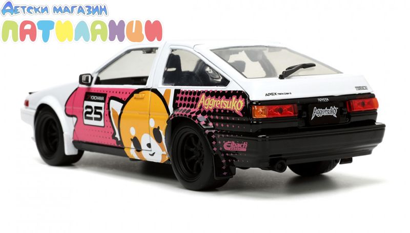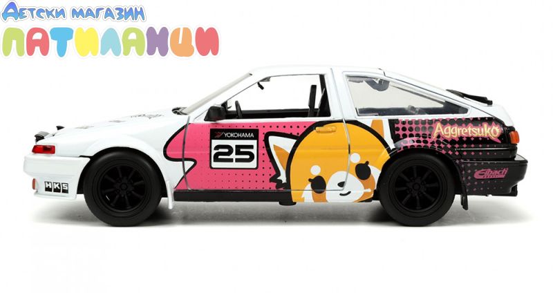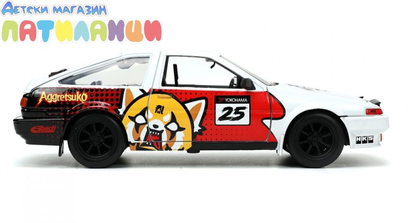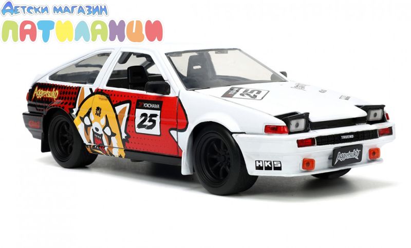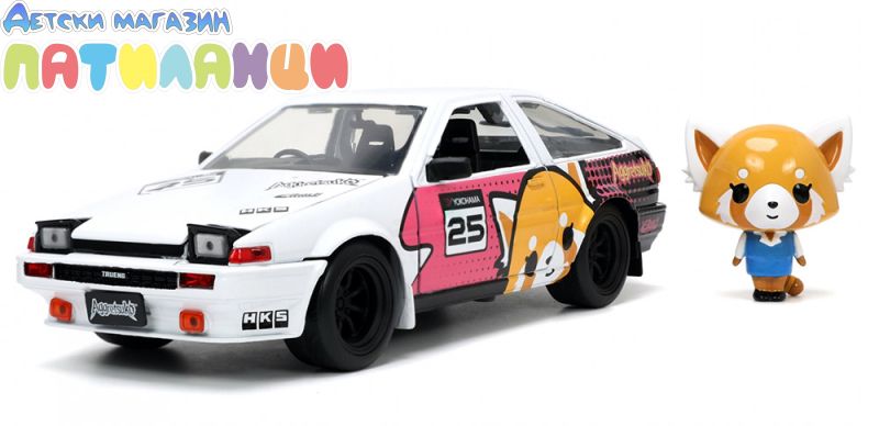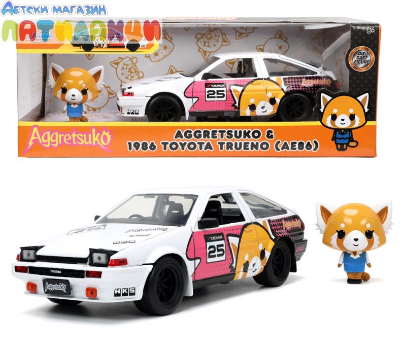 Този комплект от чисто новата поредица на Jada "Anime Hollywood Rides" включва сладка червена панда, обичаща хеви метъл, и фигурка на счетоводителя Агрецуко от създателите на Hello Kitty. Предлага се и с красиво декориран модел в мащаб 1:24 на класическата японска Toyota Trueno. Автомобилът има отварящи се врати, както и отварящ се капак и багажник. Задължително за всички фенове на Aggretsuko!