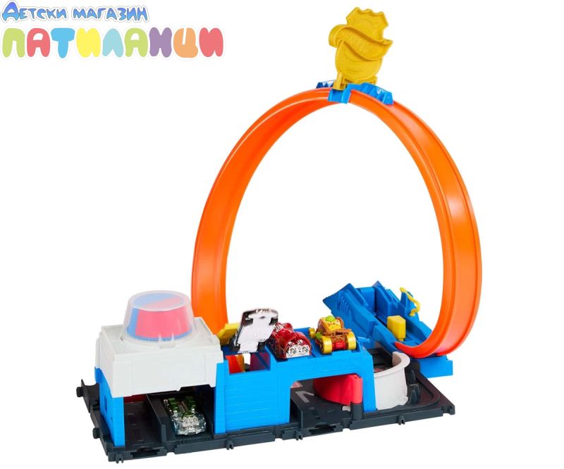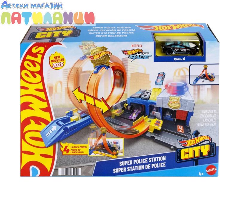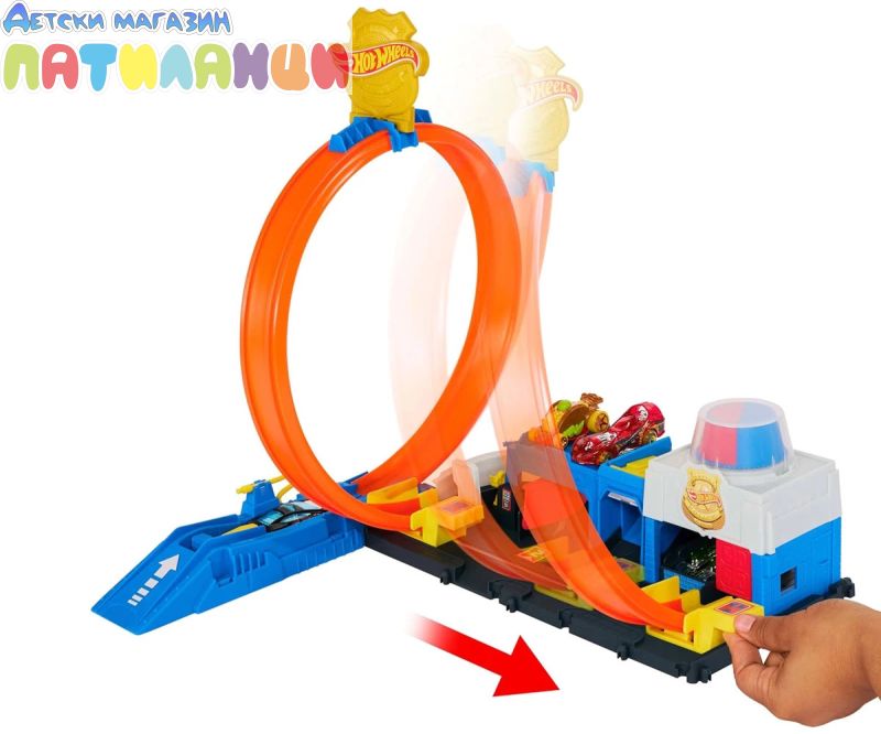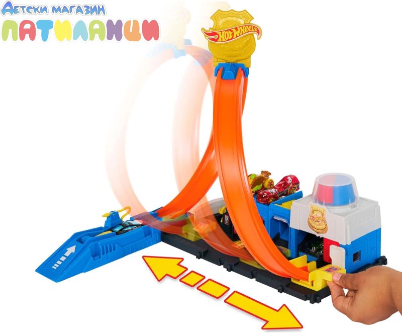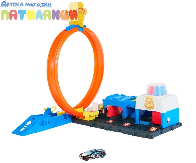 Има четири различни начина да се състезавате и да правите трикове с комплекта за игра Hot Wheels City Полицейски участък с регулирана писта! Вкарайте включената количка в машина 1:64, изработена от метал, в стартовата станция, където има гъвкава маркировка за зареждане, преди да бъде изпратено към второто приключване. Плъзнете я по люлеещата се писта, която може да се настрои в четири различни посоки, всяка от които показва различен трик или изход. Паркирайте до четири превозни средства на игралното поле и свържете други писти и игрални комплекти за незабравима игра. Включен е един автомобил, допълнителни превозни средства и писти се продават отделно. Цветовете и декорациите могат да варират.