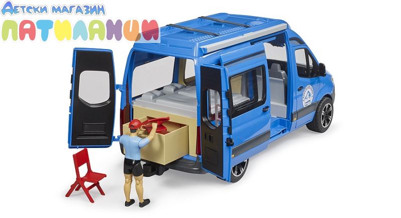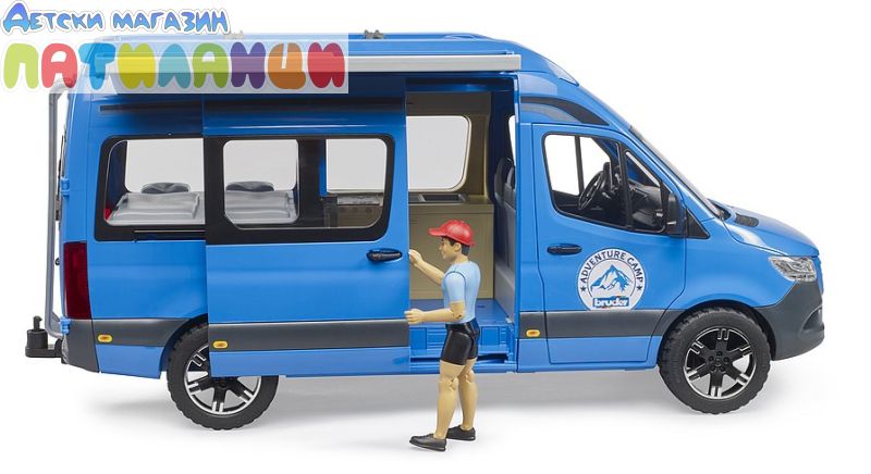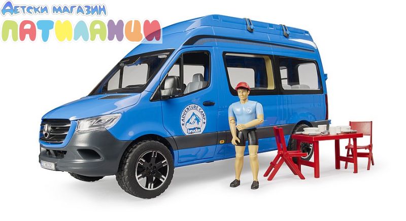 Къмпингуването е абсолютно в тенденция. Регистрациите на мобилни домове в цяла Европа достигнаха нови висоти през 2018 г. и 2019 г. Тази вълнуваща тема за свободното време вече може да бъде изпитана от младите къмпингуващи в BRUDER. Новият MB Sprinter е изключително успешен и като базов модел за кемпери. Версията BRUDER на новия кемпер MB Sprinter има впечатляващо ниво на детайлност и гъвкавост. Вратата на кабината на водача и задните врати се отварят. Тук предоставената фигура bworld има достъп до интегрираното двойно легло и голямо отделение за съхранение. Особен акцент е новоразработената плъзгаща се врата от страната на водача, която осигурява достъп до кухненския модул. Кемперът има разтегателен сенник за слънчеви дни, както и стилни къмпинг мебели и сервизи. Страхотни аксесоари за кемпера са каякът bworld (арт. № 63155), който може да се транспортира на покрива.