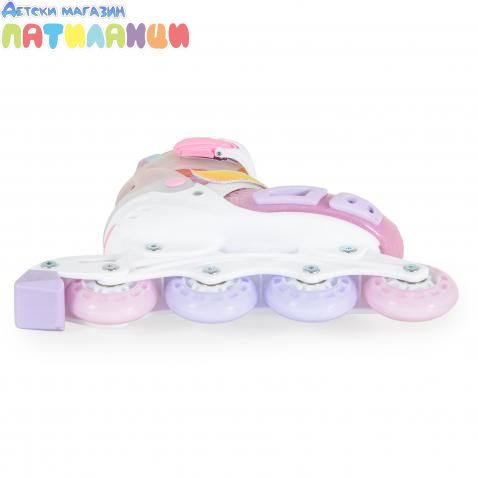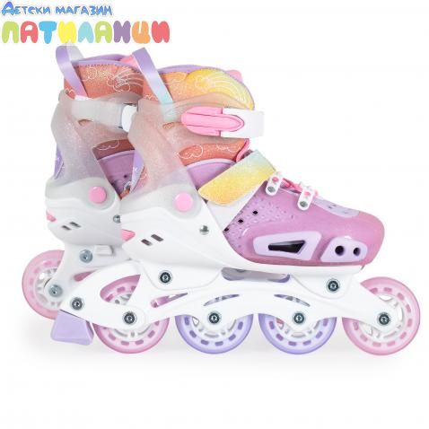 Ролкови кънки с регулируем размер, подходящи за начинаещи. Обувки от висококачествен PP с катарама; Опушени: регулируеми с катаракти, велкро ленти и нитове; Горен материал: дишащ велур с тъкана материя и EVA шприцована горна част; PU 64x24mm за размер 29-33, 70x24mm за размер 34-38; Лагери: ABEC-5 от въглероден зъболекар; Спирална подложка: TPR; Рамка и шаси: висококачествен PP
