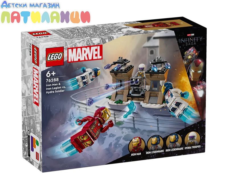LEGO® Marvel Железния човек и Железния легион срещу Хидра (76288) пресъздава сцена от Отмъстителите: Ерата на Ултрон на Marvel Studios, където Железния човек и 2 Железни легионери летят до укрепената база на Войника на Хидра. Този комплект за конструиране със супергерой има много готини функции и аксесоари, което го прави чудесна играчка за конструиране за деца, особено за фенове на Отмъстителите, на възраст над 6 години. Комплектът включва 4 минифигури: Железния човек, 2 Железни легионери и войник на Хидра. Железния човек има отварящ се визьор и държи мощен бластер. Войникът на Хидра има оръдие. Включени са прозрачни сини тухли, за да се създаде впечатлението, че минифигурите летят. Базата на Хидра за конструиране разполага с 2 оръдия, прикрепени към въртящ се под, където децата могат да разположат Войника на Хидра, взел на прицел пристигащите герои. На върха на кулите на базата има 2 двойки ракетни установки (не стрелят), за отбиване на атаката. Добавените цифрови функции са достъпни чрез приложението LEGO Builder.