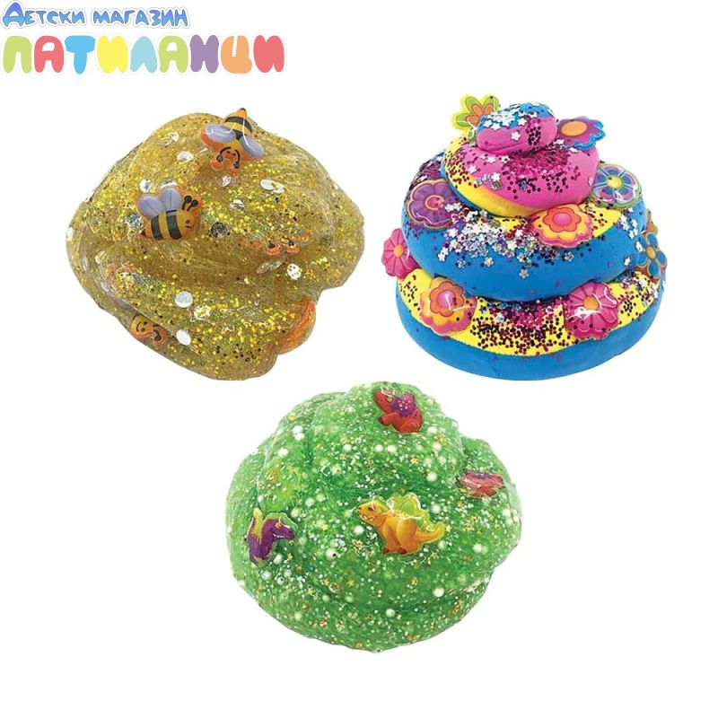 Всяко контейнерче съдържа цветно желе за игра, 14 талисмана и 2 пликчета с брокат и конфети.