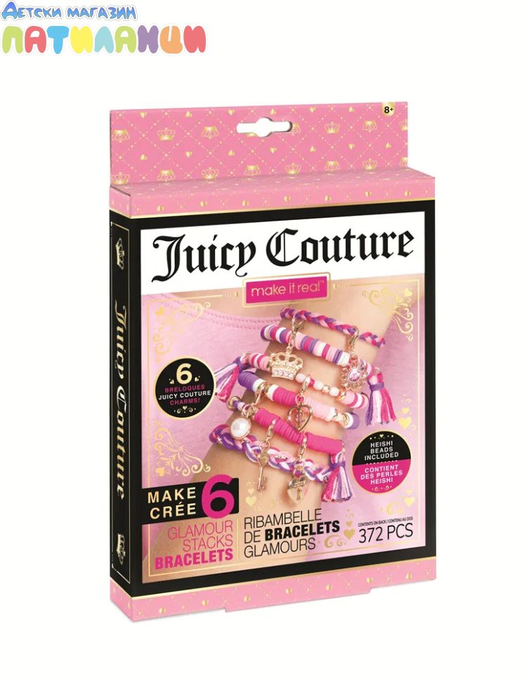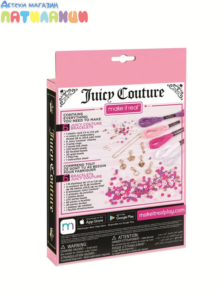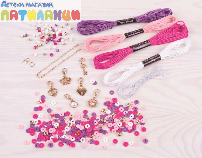 Комплектът съдържа: 1,5 м прозрачна корда, 4 цвята цветни нишки общо 28 м, 6 талисмана Juicy, 3 халкички, верижка, 270 мъниста heishi, 65 мъниста faseted, 30 златисти мъниста, игрална подложкка, инструкция.