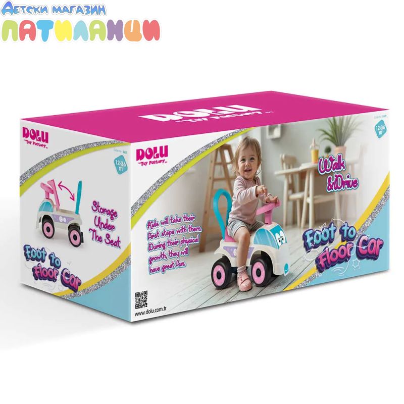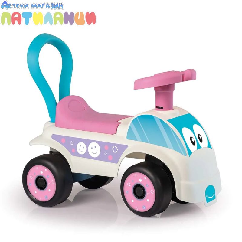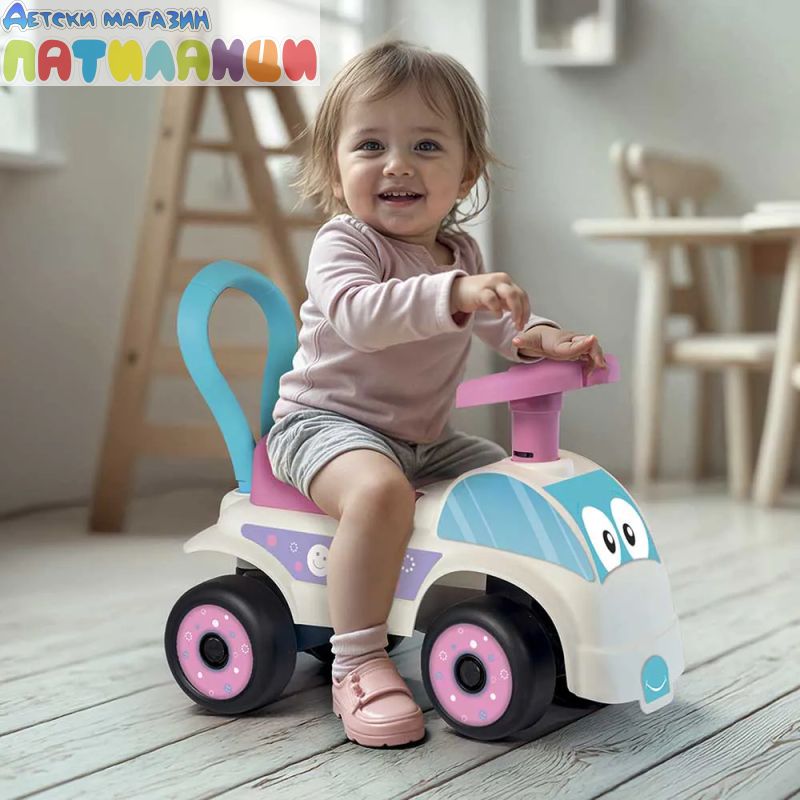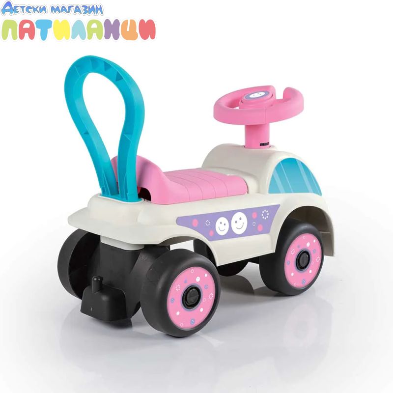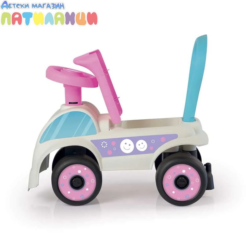Тази кола за возене и бутане има дизайн на супер готина състезателна кола. Просто се качи, бутай с краката си и потегляй! Повози се на удобната седалка или използвай дръжката на гърба. Можеш дори да повдигнеш меката розова седалка, за да разкриеш удобно място за съхранение – какво ще вземеш със себе си за приключенията? Разполага и с клаксон, за да може всеки да чуе пристигането ти!