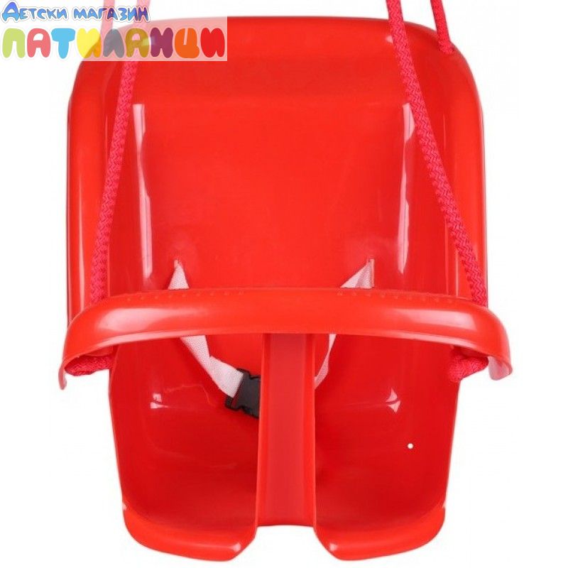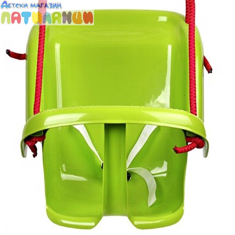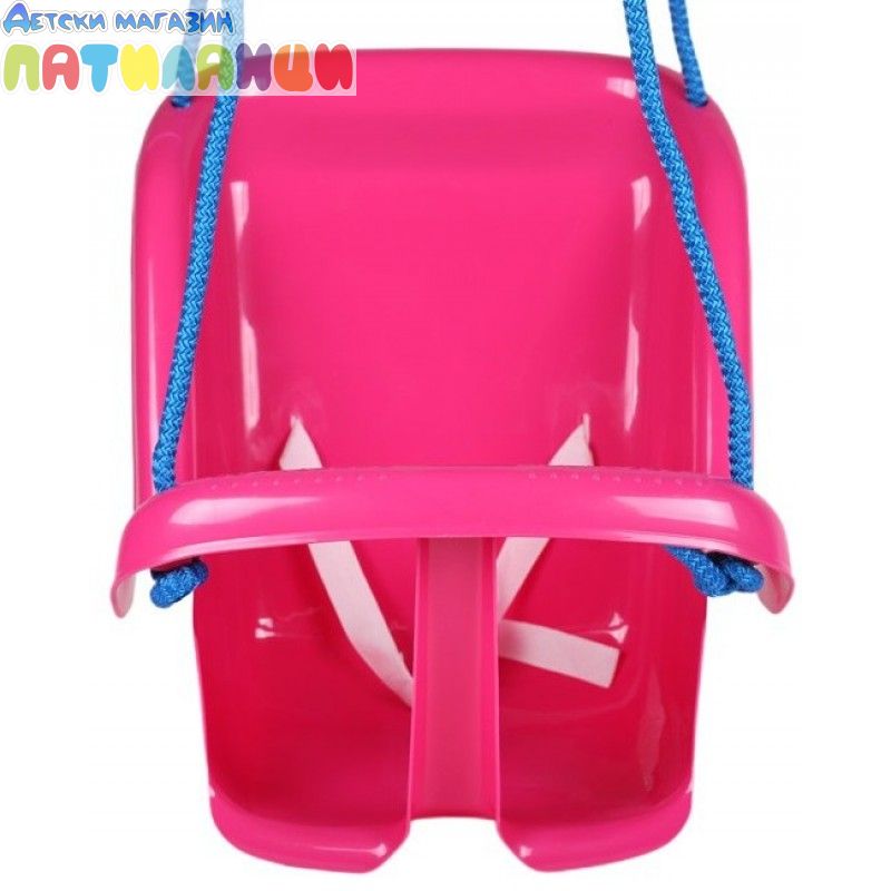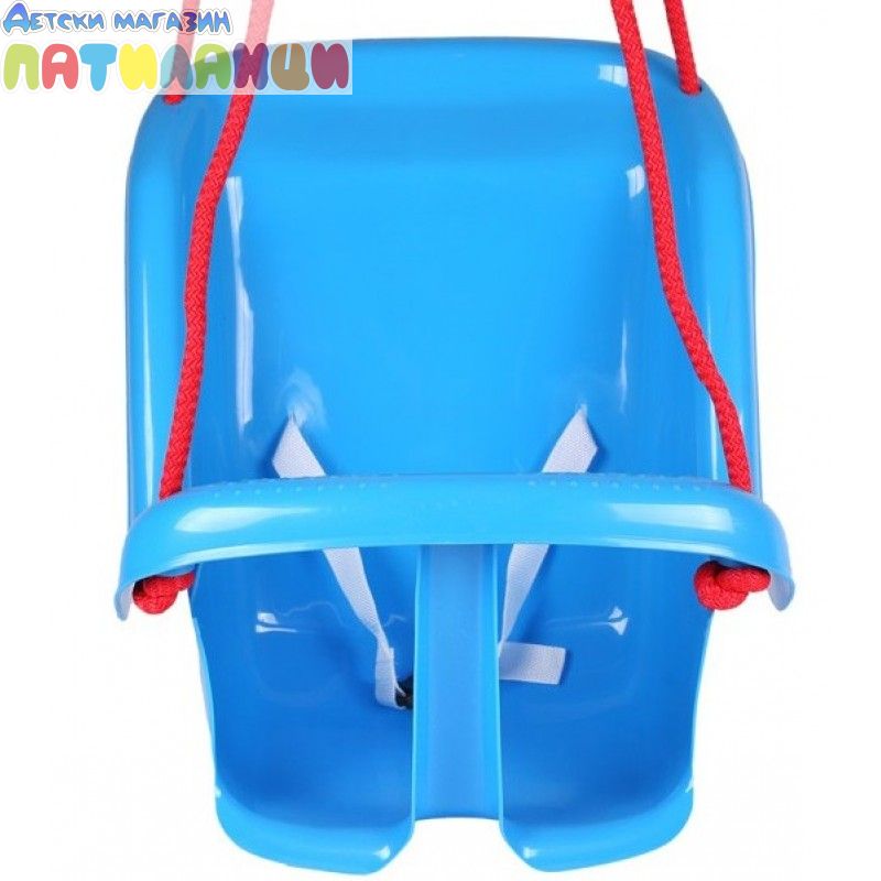 Детска пластмасова люлка със здрави въжета, подходяща за монтаж на двора или за закачане на тавана у дома. Седалката е удобна за ползване заради анатомичната си форма и висок гръб. Освен това е обезопасена с предпазен колан, който се закопчава посредством пластмасова катарама.