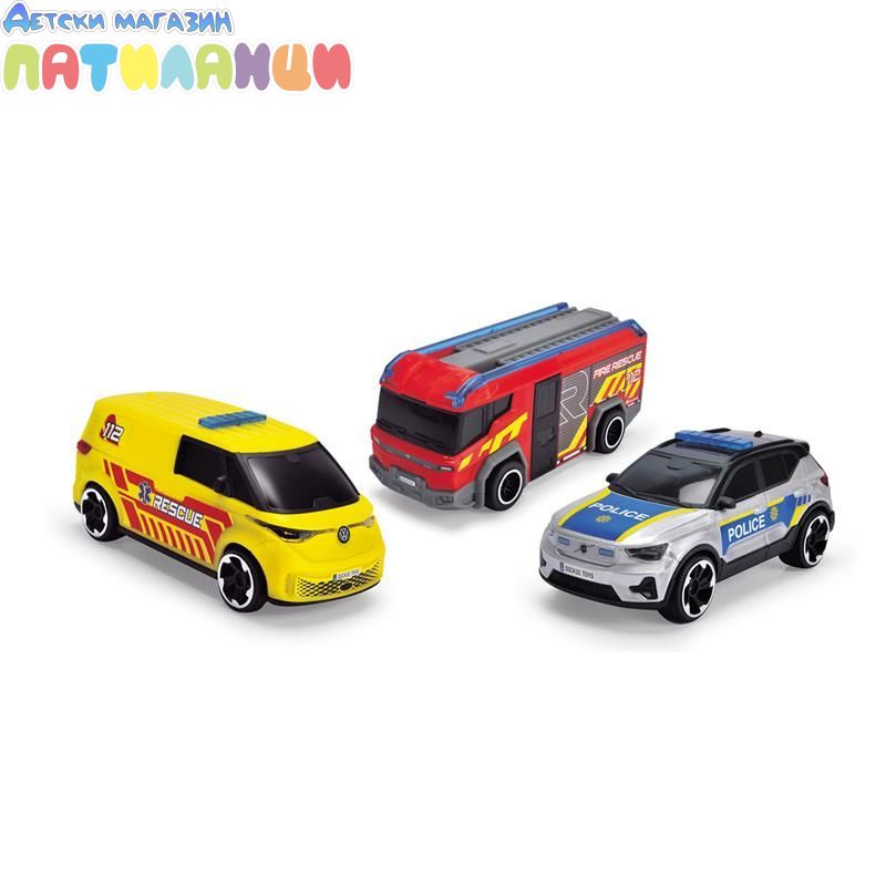 Пакет от 3 коли за спешна помощ с прибл. 15 см: 1 полицейска кола (Volvo), 1 линейка и 1 пожарна кола (Volkswagen).
