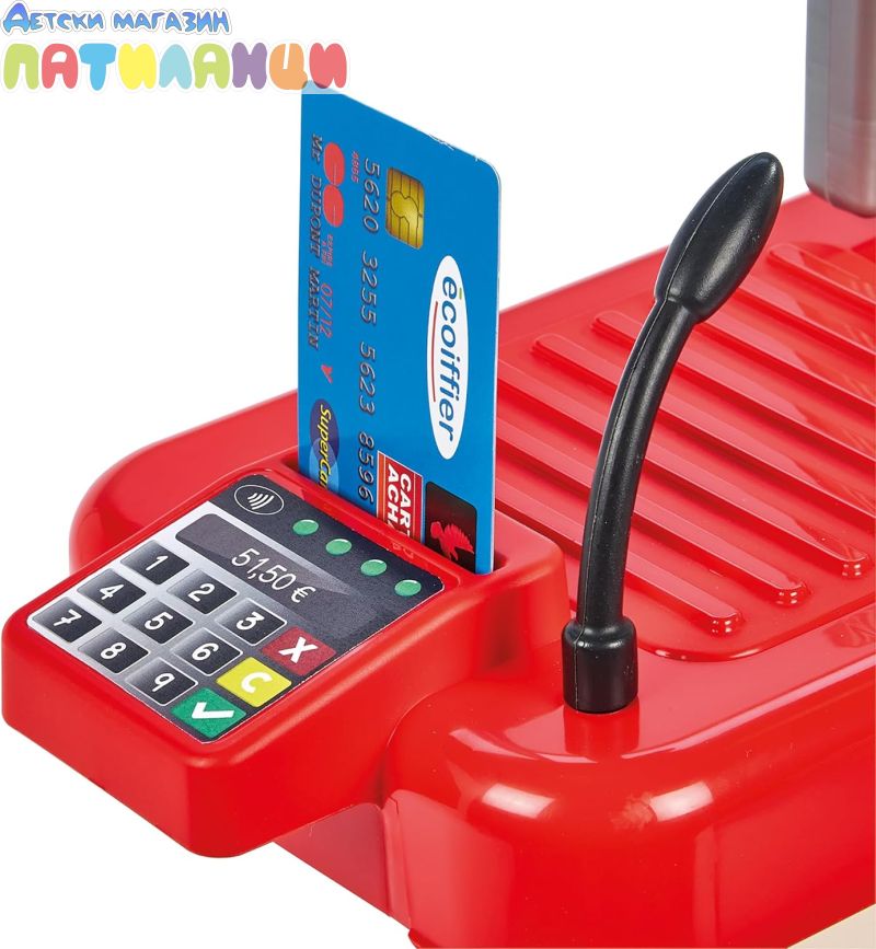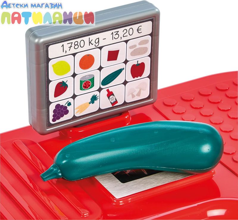 ПЪЛЕН МАГАЗИН: Тази каса в супермаркета е пълна с продукти за закупуване и има кредитна карта и терминал за четене, микрофон, кантар за плодове и зеленчуци и голяма количка!