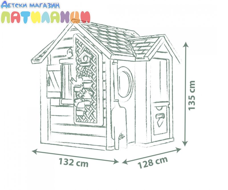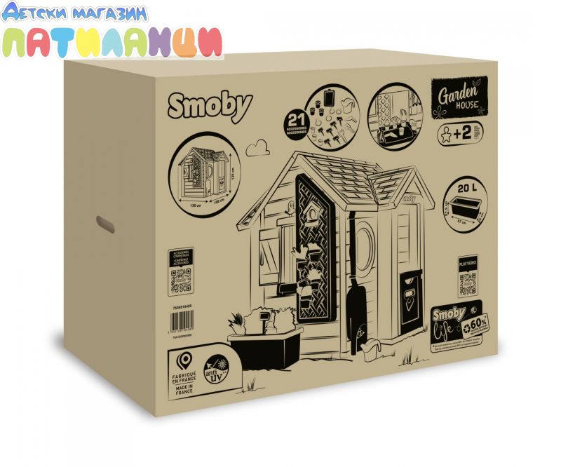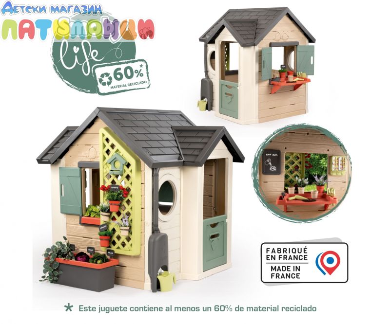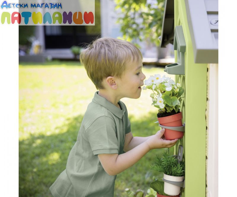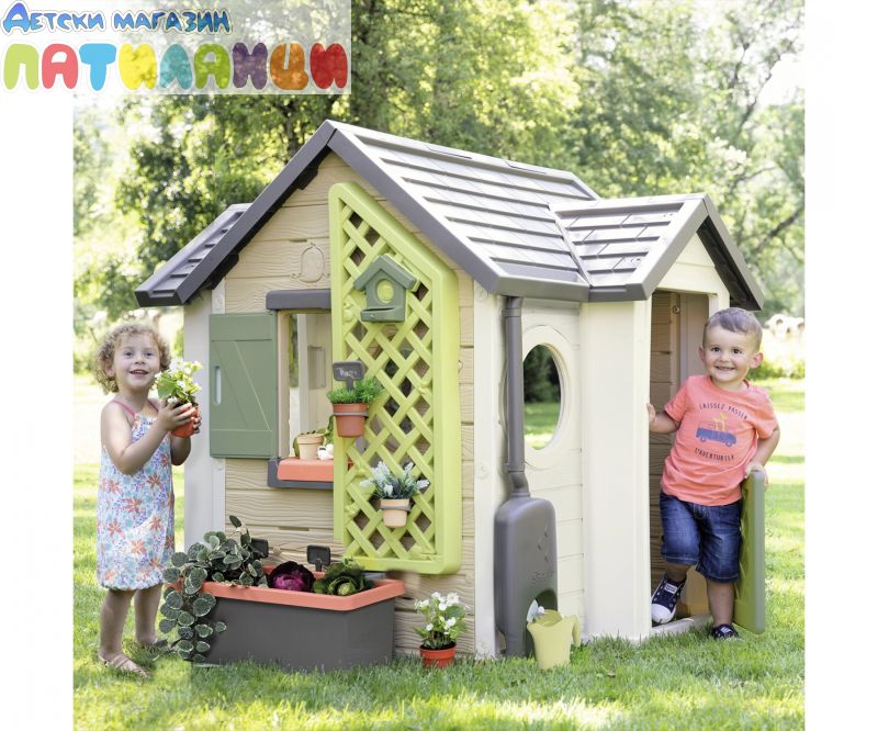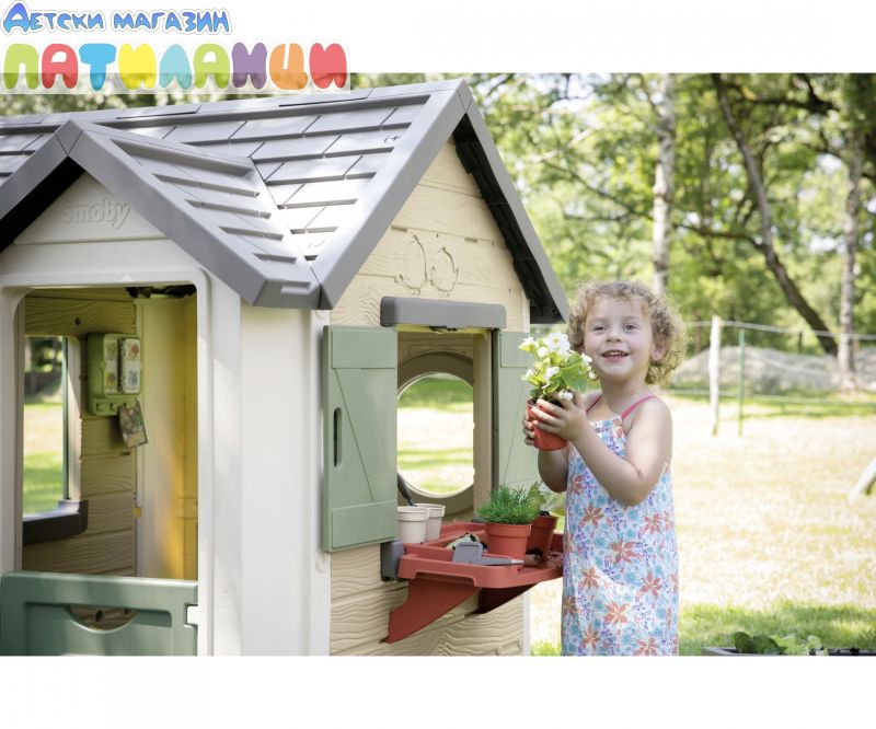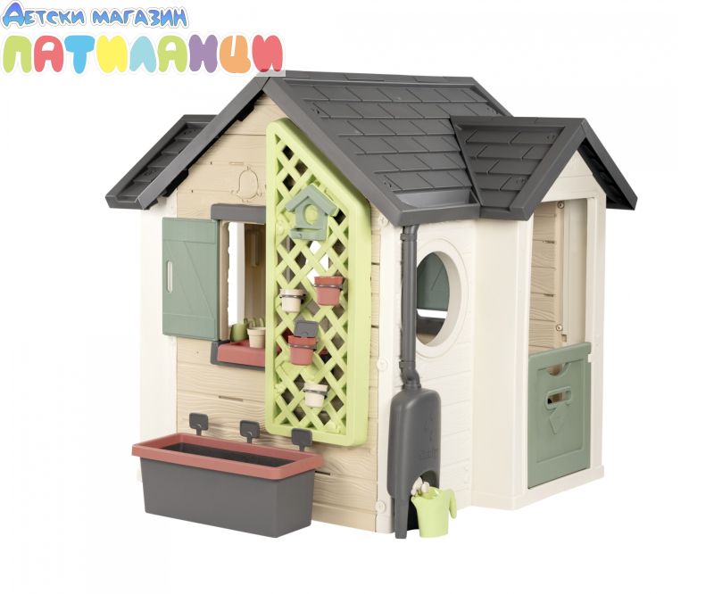 Снабдена с 1 порта, 2 прозореца с капаци на панти и 2 илюминатора, Garden House има и много функции за игра: голяма саксия, пергола за окачване на малки саксии и хранилка за птици, както и колектор за вода с лейка.