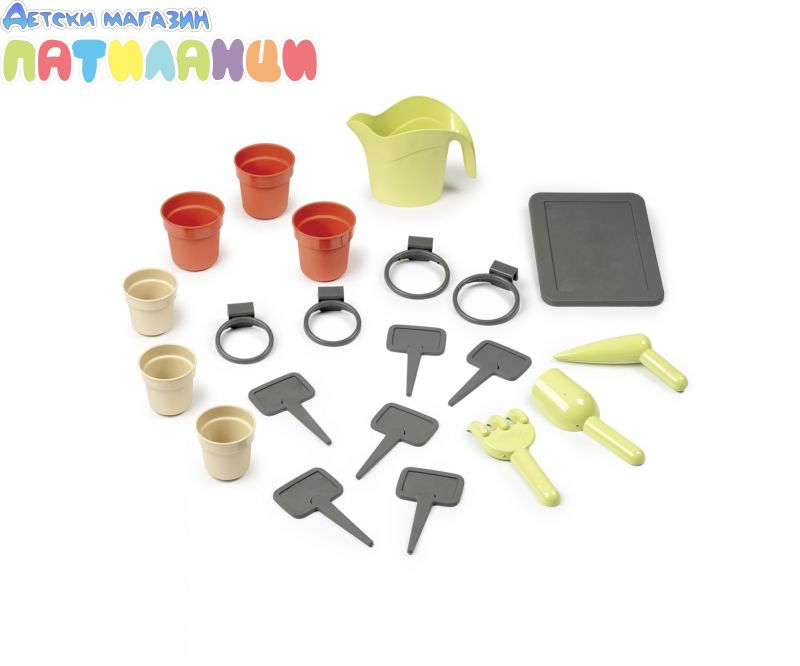 Включени са много аксесоари за подобряване на функциите за игра: 3 инструмента (лопата, гребло, сеялка), 6 саксии, 1 плоча за отбелязване на вашите насаждения, знаци за зеленчуковата градина (с текстура на плоча за писане с тебешир), както и малка книжка за градинар с 3 щипки за закачане на етикети или пакети със семена.