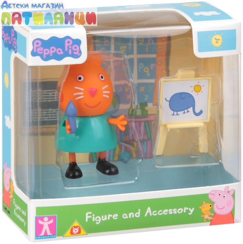 Комплектът е част от серията Peppa Pig, където ще откриете още играчки и аксесоари по темата. Той се състои фигурка на котката Кенди и тематичен аксесоар.