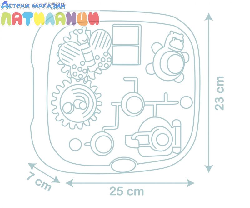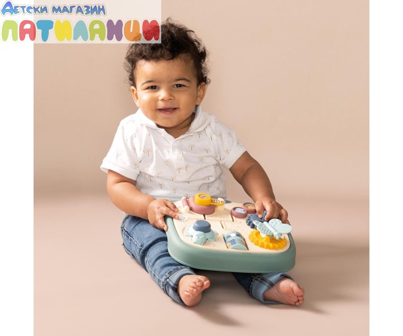 Благодарение на удобния си размер и странични дръжки, Activity Board може да се носи навсякъде. Добре обмисленият дизайн без разхлабени части поддържа неусложнена и безопасна работа за бебета и малки деца от 12 месеца. Меките цветове и сладките животински мотиви създават успокояваща атмосфера за игра, която приканва към открития – идеални за подарък и детска играчка!