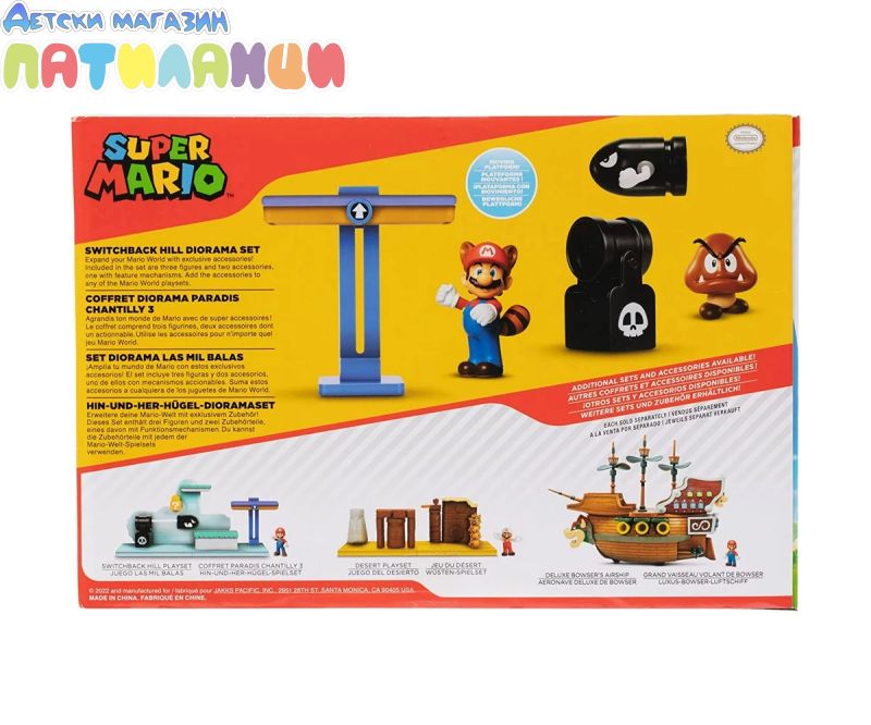 Комплектът диорама Switchback Hill ви позволява да се насладите на тази забавна обстановка, вдъхновена от видеоигрите Super Mario™. Децата може да разшири своя Супер Марио свят с фигури и изключителни аксесоари с функционални механизми. Марио може да се движи нагоре и надолу по платформата за повдигане, а Bullet Bill може да бъде добавен в Bill Blaster, точно както в играта. Аксесоарите са модули и могат да се използват и с комплектите за игра. Включени са също фигури от 6 см. Ракон Марио, Булет Бил и Гумба. Започнете да изграждате своя свят Super Mario™ с този удивителен набор от фигури и аксесоари!