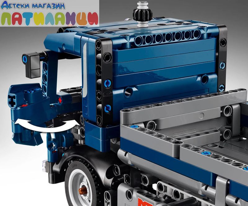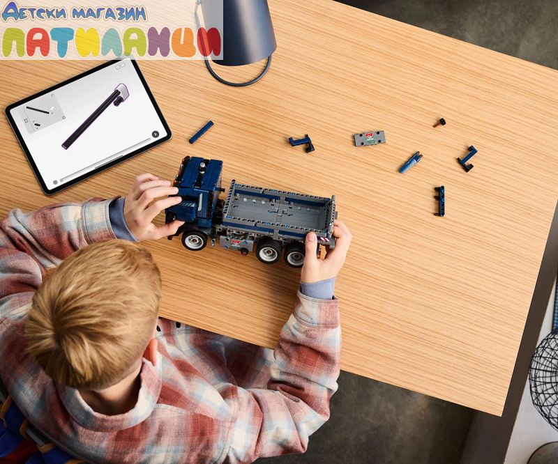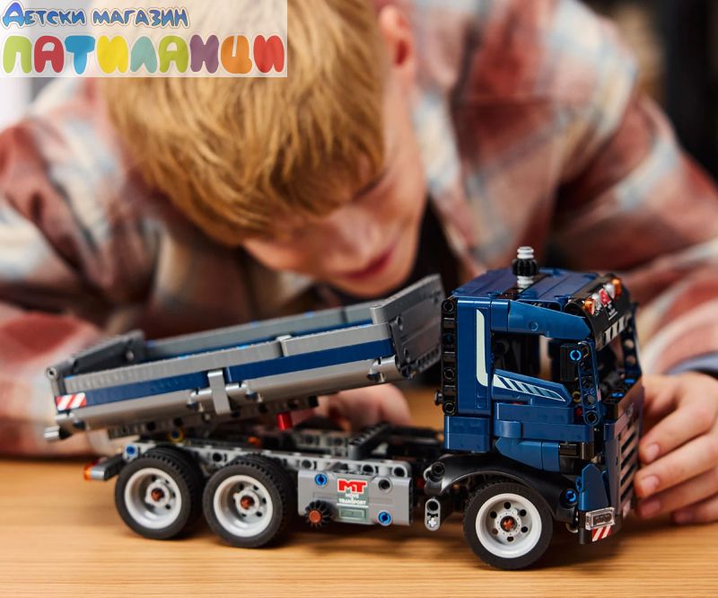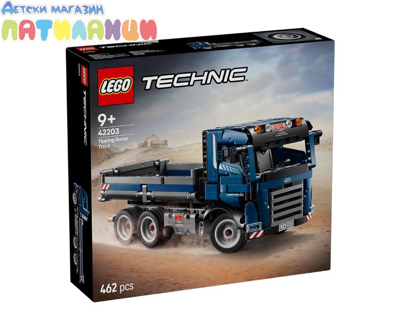 Децата на възраст над 9 години могат да създават безкрайни приключения на строителната площадка с играчката LEGO® Technic Самосвал с подвижно ремарке (42203). Този комплект със синя строителна машина позволява на деца на възраст над 9 години да сипредставят натоварен работен ден, докато управляват самосвала. Позиционирайте камиона, след което завъртете копчето отстрани, за да наклоните каросерията. Отворете вратите, за да погледнете вътре в кабината, след което закарайте камиона до следващата м у задача на строителната площадка. Комплектите превозни средства LEGO Technic се отличават с реалистично движение, за да въведат младите строители с LEGO в света на техниката. Този детски строителен комплект е забавен подарък за рожден ден или изненада по всякакъв повод за деца, които обичат превозни средства LEGO или строителни камиони. Децата могат да се наслаждават на лесно и интуитивно строително приключение с приложението LEGO Builder, където могат да мащабират и завъртат 3D моделите, да запазват комплекти и да проследяват напредъка си.