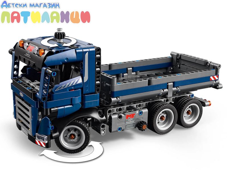 Поддържайте нещата в движение на строителната площадка с този самосвал LEGO® Technic! Позиционирайте камиона. Завъртете копчето отстрани на камиона, за да наклоните каросерията. Отворете вратите, за да погледнете вътре в кабината, след което закарайте неуморния камион до следващата му задача на строителната площадка.