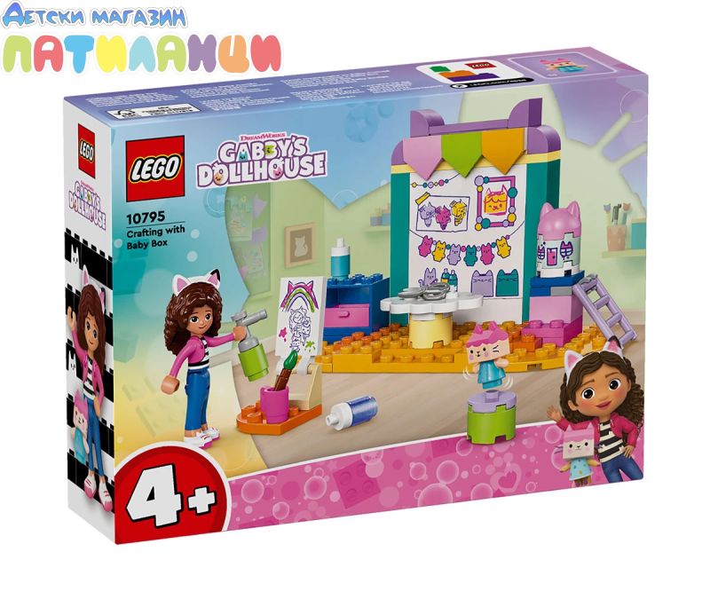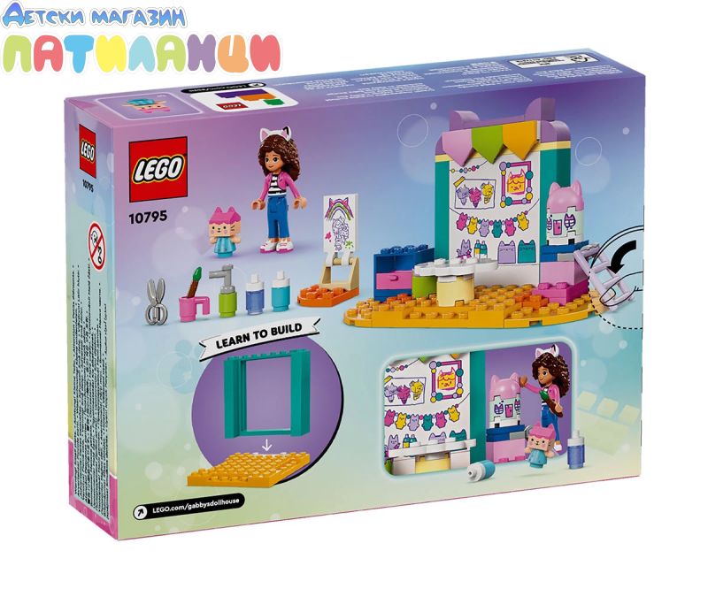 LEGO® 4+ Куклената къща на Габи Творчество с Baby Box (10795) е играчка за игри наужким за деца над 4 години, която развива творческите умения и вдъхновява играта наужким. Този детски комплект с куклена къща е изпъстрен с ярки цветове и идва с познати герои и забавни функции, които феновете на Куклената къща на Габи на DreamWorks Animation познават и обичат. Тази играчка LEGO за момчета и момичета е и художествен комплект. Този строителен комплект за игри наужким включва четка за рисуване, бои, ножици и спрей, както и миникукла на Габи и фигура на Baby Box. Заедно Габи и Baby Box рисуват картина и строят модел на куклената къща на Габи. Има дори и стълба, с която героите могат да стигнат до върха на модела. Комплектът има стена с рисункии подаващи се от покрива котешки ушички. Комплектът идва с множество завладяващи детайли за вдъхновяване на творческа игра и включва начална тухличка, която помага на децата да започнат да строят. Ръководството с картинки и история предлага интуитивни инструкции.