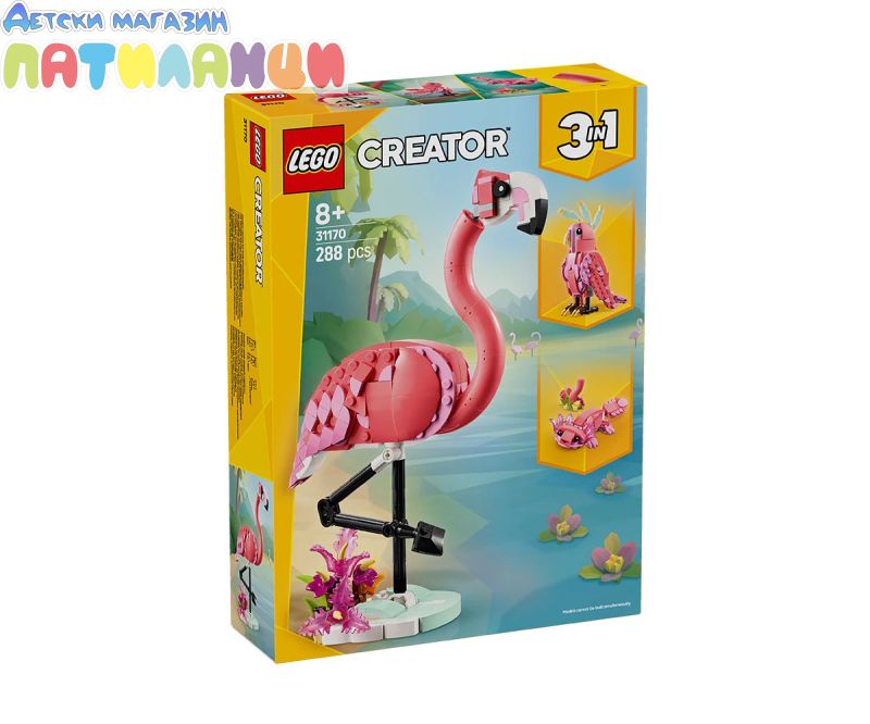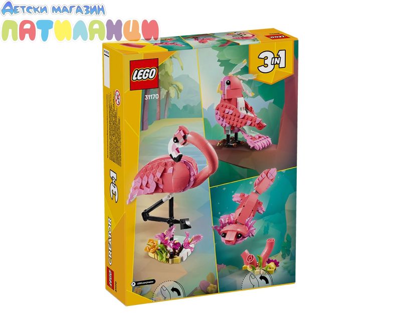 Зарадвайте момичета и момчета на възраст над 8 години с този фантастичен комплект за игра LEGO® Creator „3 в 1“ Диви животни: Розово фламинго (31170). Розовото фламинго има подвижна глава и стои кацнало на малка стойка, покрита с растения, така чедецата да могат да се насладят на часове въображаема игра или да я покажат като част от декора на стаята. Този комплект LEGO предлага на децата 3 различни възможности за изграждане с едни и същи тухлички: розово фламинго с подвижна глава на стойка, пок рита с растения, подвижно розово какаду, което може да върти главата си на 360 градуса, или очарователен подвижен розов аксолотъл с подводни растения. Всичките 3 сладки трансформиращи се животни LEGO са забавни подаръци за деца. Комплектите LEGO Creator „3 в 1“ вдъхновяват детското въображение с 3 различни модела за сглобяване във всяка кутия. Децата с удоволствие ще построяват и променят моделите многократно. Комплектите „3 в 1“ предлагат гама от модели, които задоволяват най-големите им увлечения, включително свръхбързи превозни средства, невероятни животни и детайлни къщи. Моделите не могат да бъдат построени едновременно.