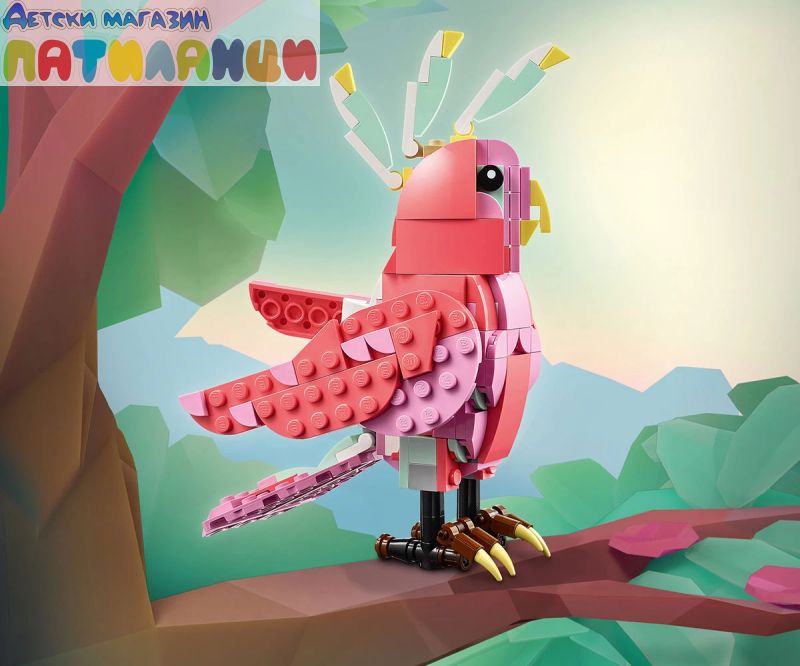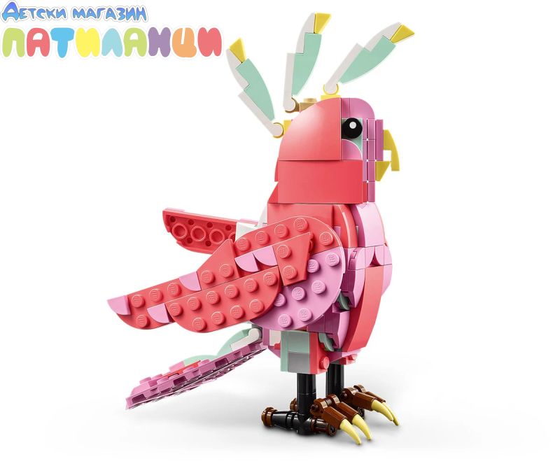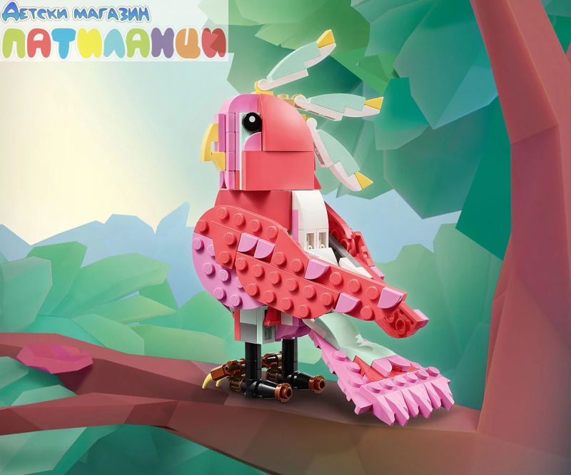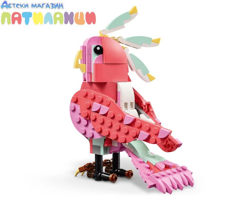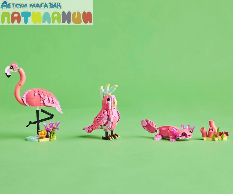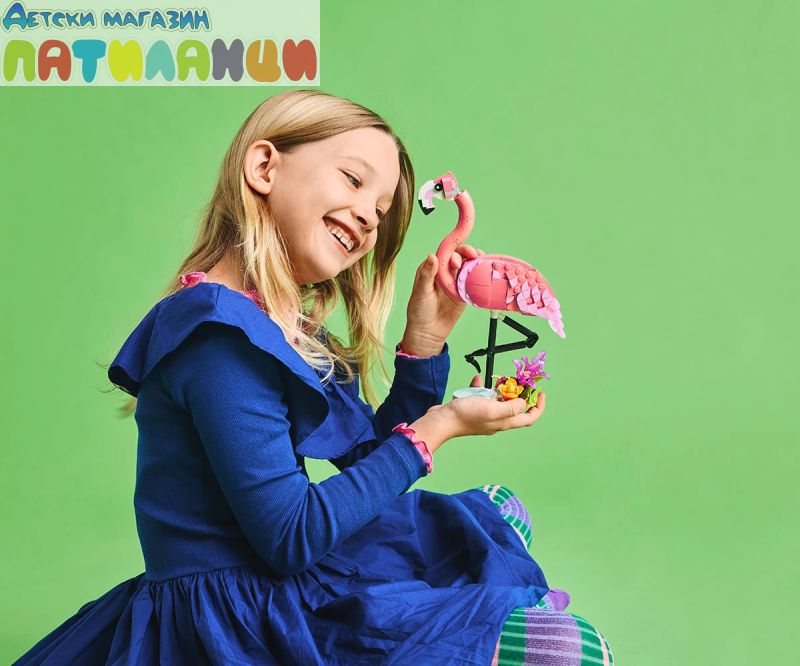 Безкрайни възможности за игра – децата могат да разиграват ролеви истории с 3 различни модела животни (имайте предвид, че моделите не могат да бъдат построени едновременно): розово фламинго, розово какаду или розов аксолотъл;