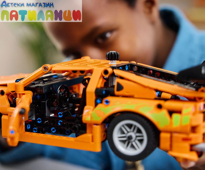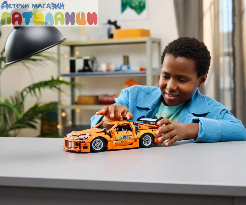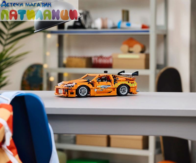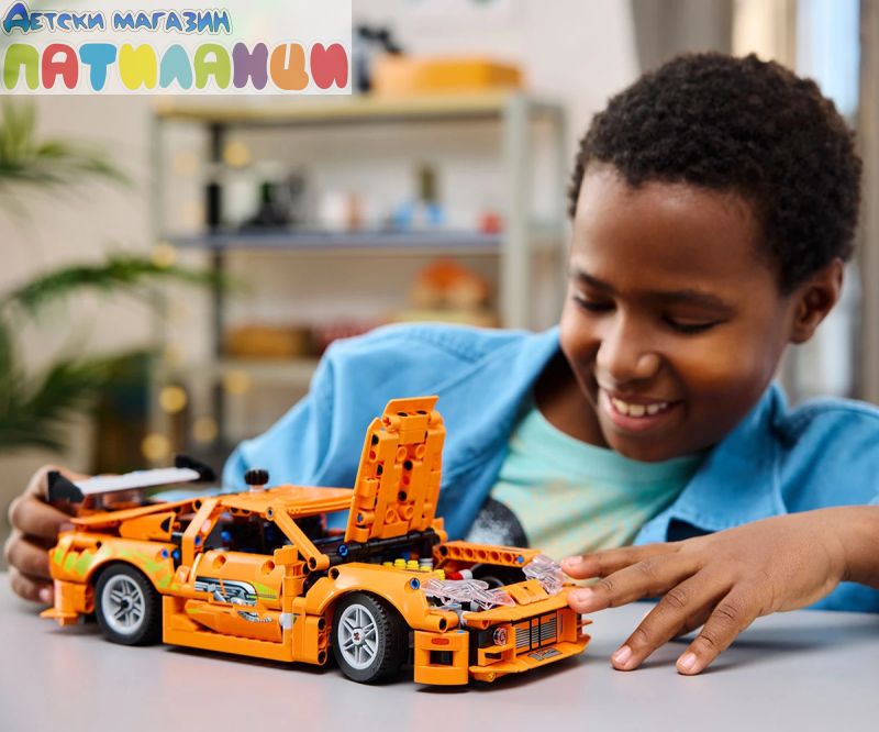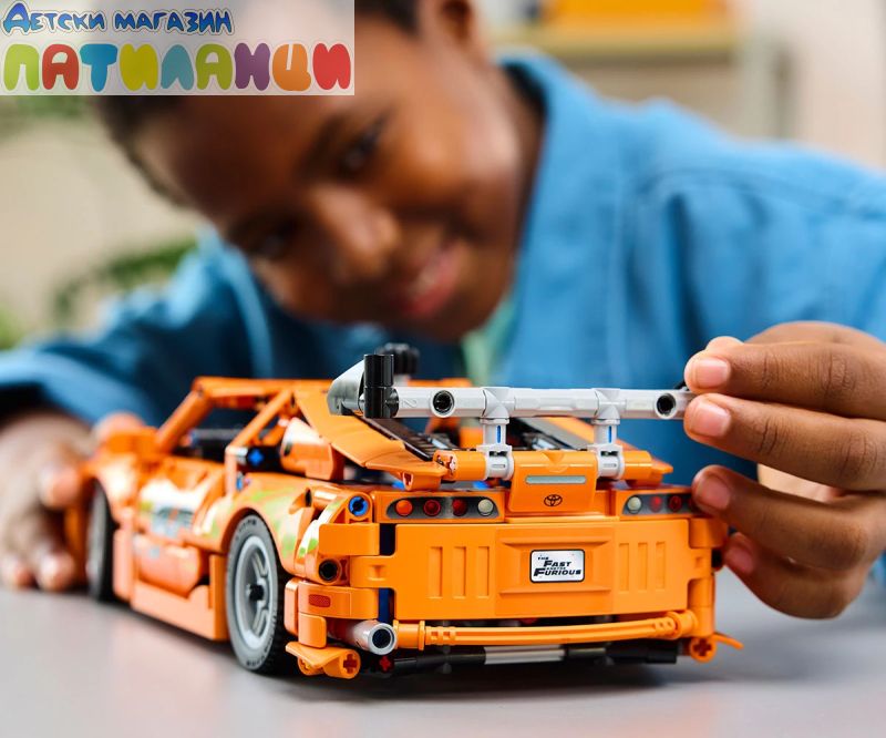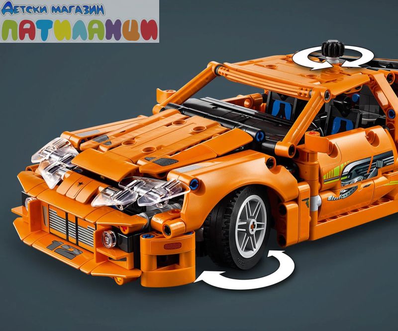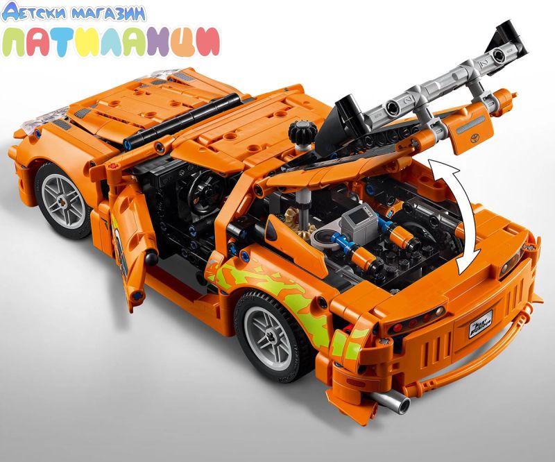 Конструктор с кола LEGO® Technic Fast and Furious Toyota Supra MK4 с 6-цилиндров двигател, кормилно управление, отварящ се капак и 2 бутилки NOS.
