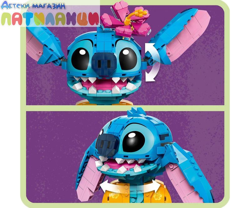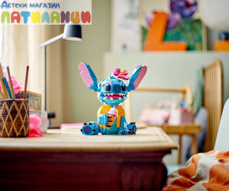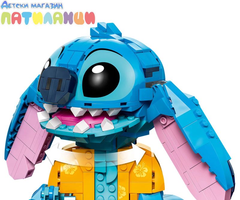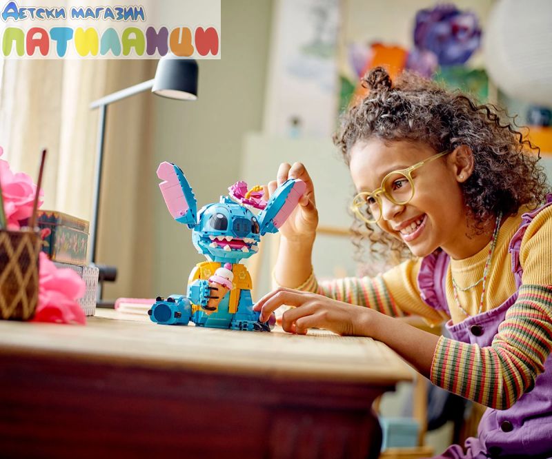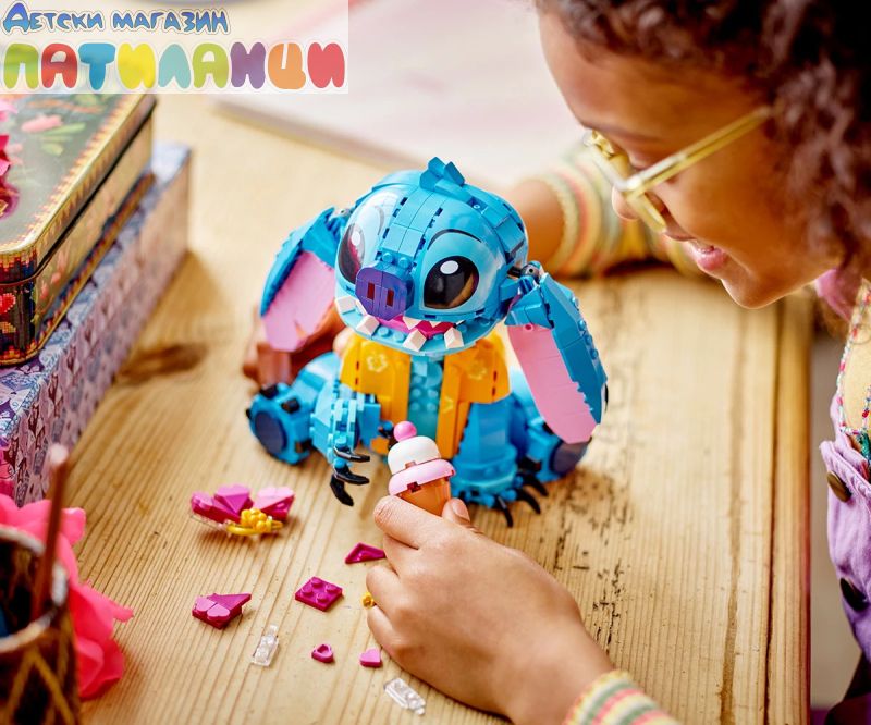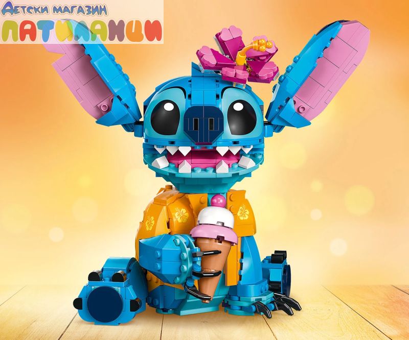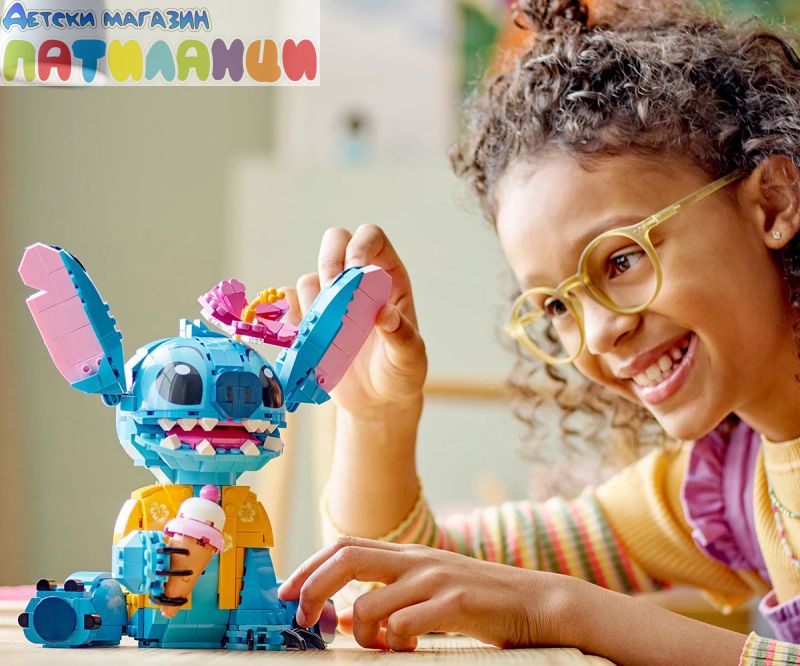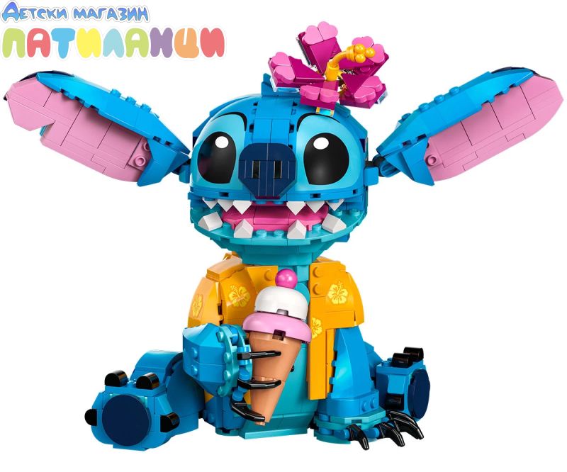 Поглезете всяко дете с комплекта за конструиране и игра, включващ героя Стич от LEGO® ǀ Disney с движещи се уши, въртяща се глава, фунийка за сладолед и други.