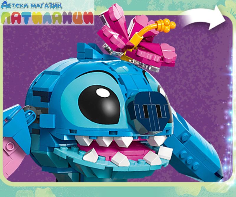Героят Стич на Disney – творческият строителен комплект LEGO® включва модел за показване от „Лило и Стич“, фунийка за сладолед и цвете за конструиране, което може да се използва за украса на героя;