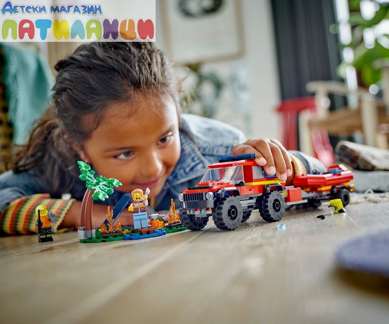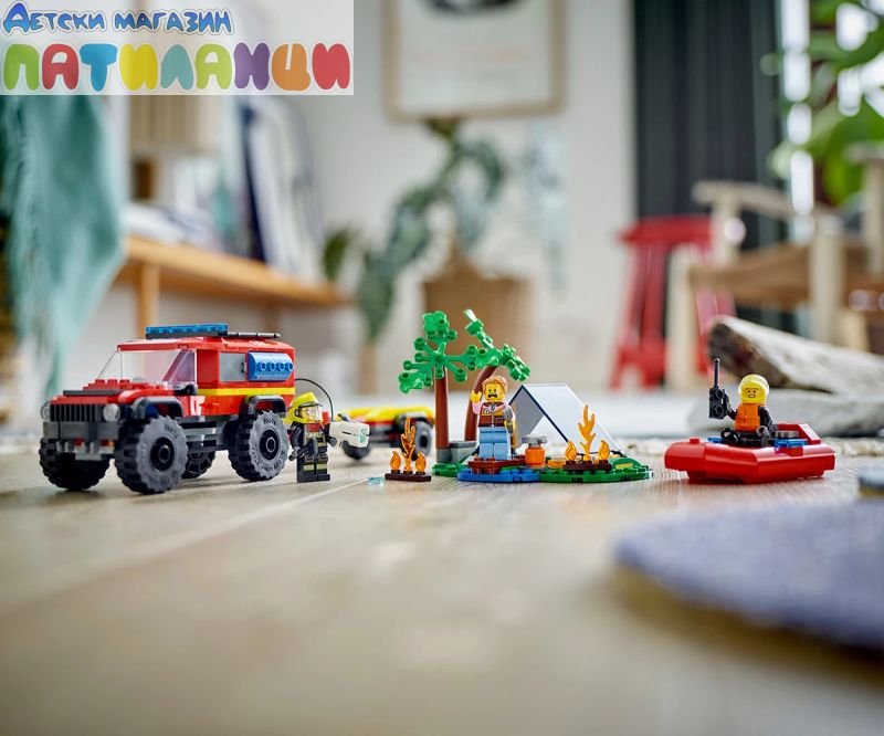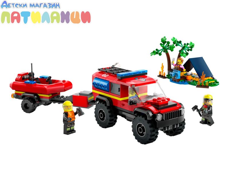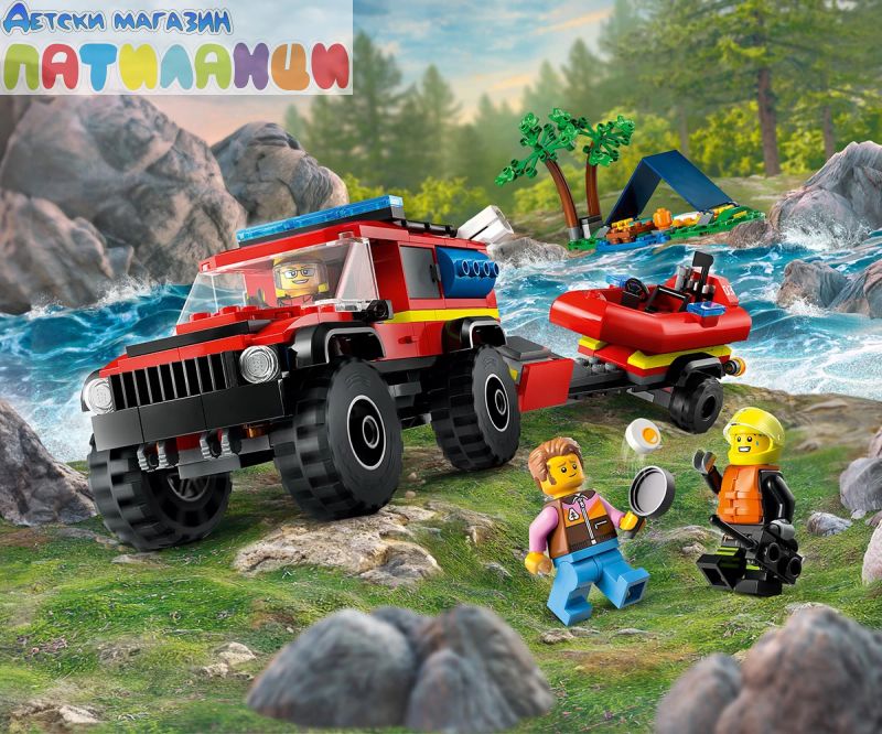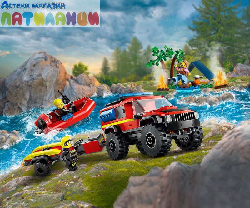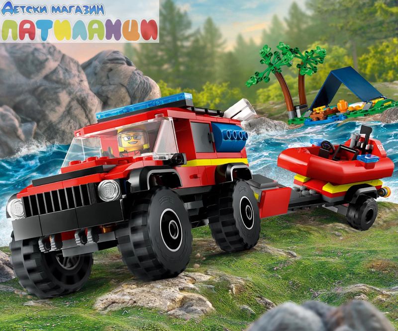 Комплектите за игра с противопожарна тематика LEGO City предоставят многофункционални земни, въздушни и водни играчки за игра с въображение без ограничения. Децата могат да добавят комплекта „Пожарникарски камион 4x4 със спасителна лодка“ към други (продават се отделно) от гамата LEGO City за още по-големи приключения!