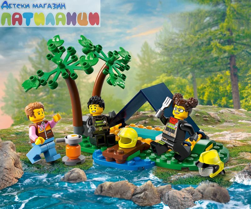 Очакват ви пожарникарски приключения с комплекта LEGO® City, включващ пожарникарски камион 4x4, спасителна лодка и палатка, плюс минифигури на лагеруващия и пожарникар.
