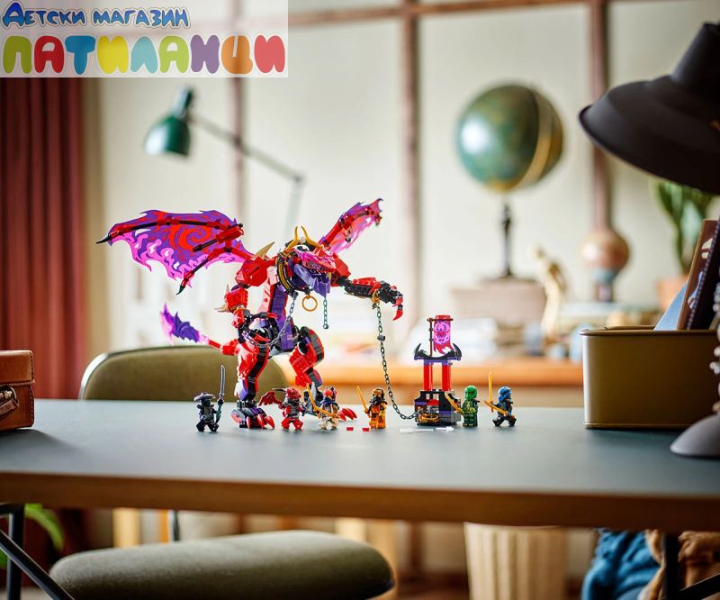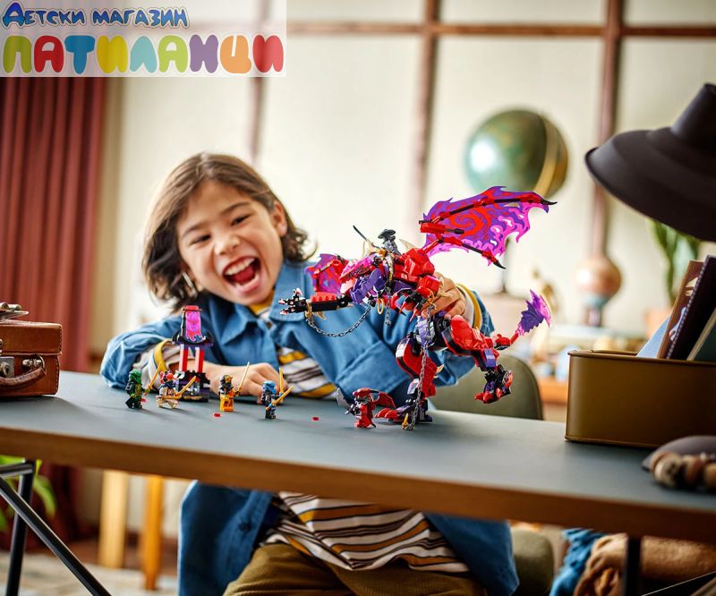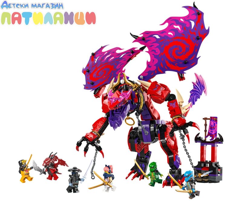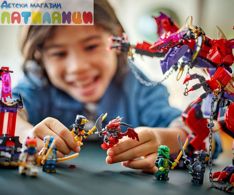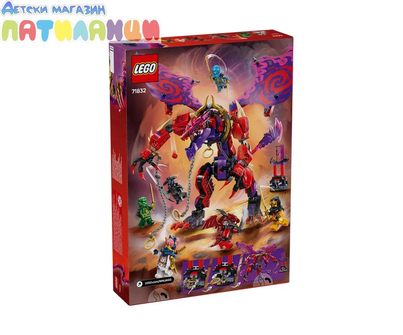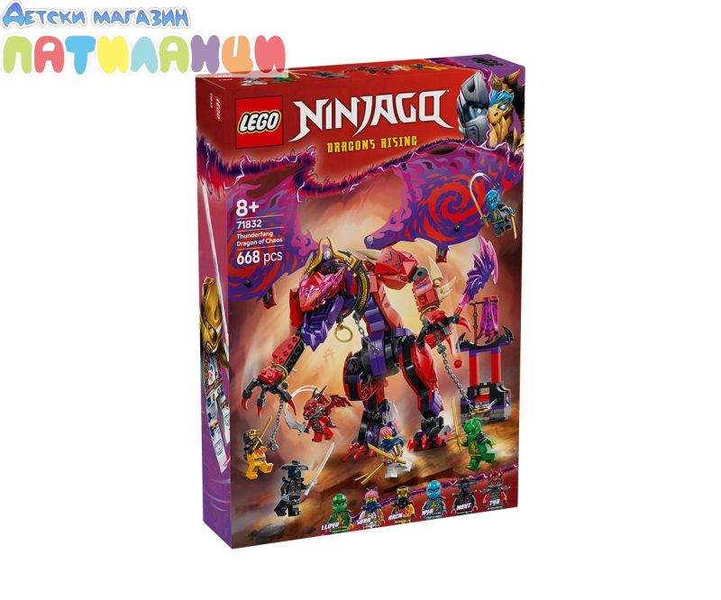 Нинджа играчката LEGO® NINJAGO® Гръмотевичен зъб, Дракон на хаоса (71832) позволява на момчето и момичето на възраст 8+ да пресъздадат вълнуващ екшън от сезон 3 на ТВ сериала NINJAGO Dragons Rising. Този строителен комплект за деца включва голям дракон с подвижна опашка, крака, крила, стъпала, глава и челюст и оръдие под всяко крило. Фигурата на дракона е прикована към малка странична конструкция и може да бъде освободена, като я отключите с двете призматични остриета. В комплекта LEGO са включени 6 минифигурки NINJAGO: нинджа войните Лойд, Ния, Арин и Сора, всеки с нинджа оръжие, плюс злодеите Нокт и Тир, предводител на хората-дракони, които също имат оръжие, за да могат децата да разиграват битки между доброто и злото. Комплектите и екшън играчките за конструиране от гамата LEGO NINJAGO (продава се отделно) включват роботи, дракони, превозни средства и храмове, така че феновете да могат да разиграват екшън между доброто и злото. Всеки нинджа комплект за игра може да бъде създаден с приложението LEGO Builder, което насочва вас и вашето дете в лесно и интуитивно строително приключение.