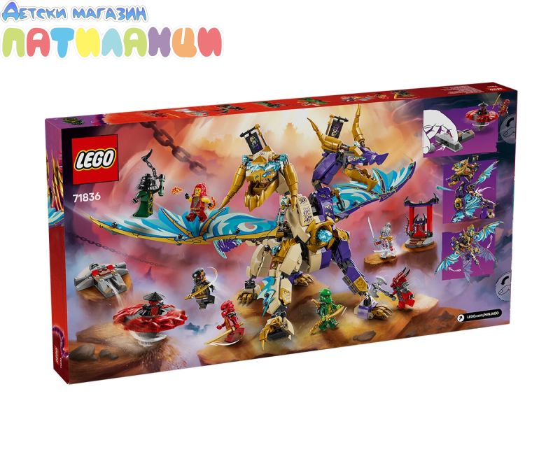 Зарадвайте момчета и момичета на възраст над 9 години с тази нинджа играчка LEGO® NINJAGO® Арк, Дракон на концентрацията (71836), която им позволява да разиграят епични екшън сцени от сезон 3 на ТВ сериала NINJAGO Dragons Rising. Този строителен комплект включва фигура на дракон с 2 глави с подвижна опашка, крака, стъпала, глава, шия, челюст и нокти. Децата могат да активират оръдието в гърдите му и да движат големите му крила от фолио напред-назад с помощта на лост на гърба му. Този боен комплект включва 8 минифигури на герои от NINJAGO за нинджа феновете, за да организират изпълнени с екшън приключения. Предлага се с нинджа воините Лойд, Коул, Уайлдфайър и Кай и техния съюзник Пиксал, всеки с нинджа оръжие, плюс злодеите Дрикс, Заркт иДраконов воин със собствени оръжия. За още по-добра игра, комплектът LEGO се предлага със страхотно превозно средство със спинер за спинджицу. Децата могат да поставят минифигура вътре и да натиснат бутона на изстрелващото устройство, който я изстрелва с въртене, след което да наблюдават как двата елемента на силата могат да излетят, когато удари целта си.