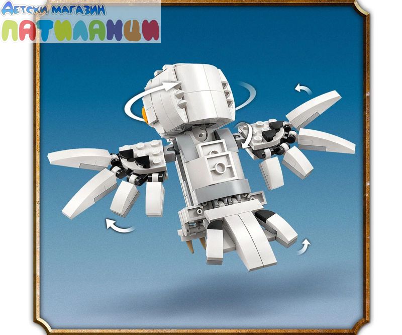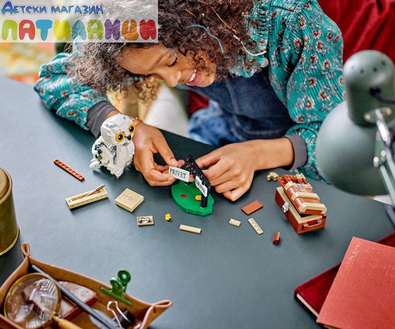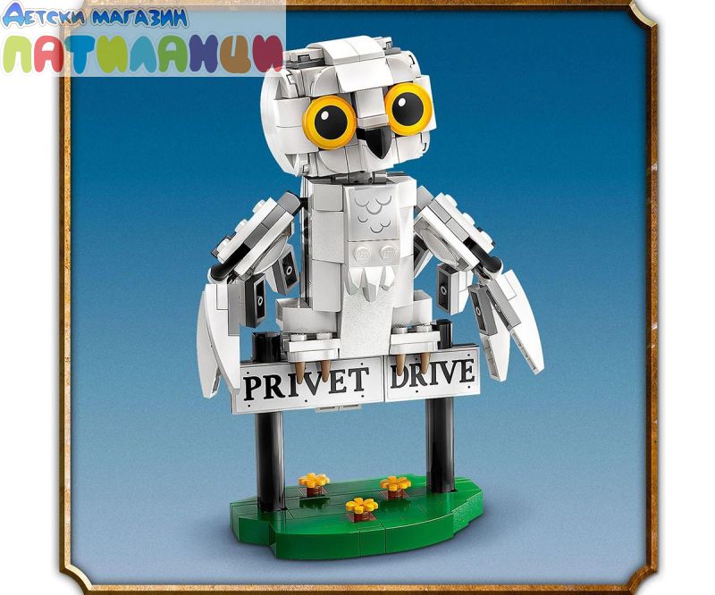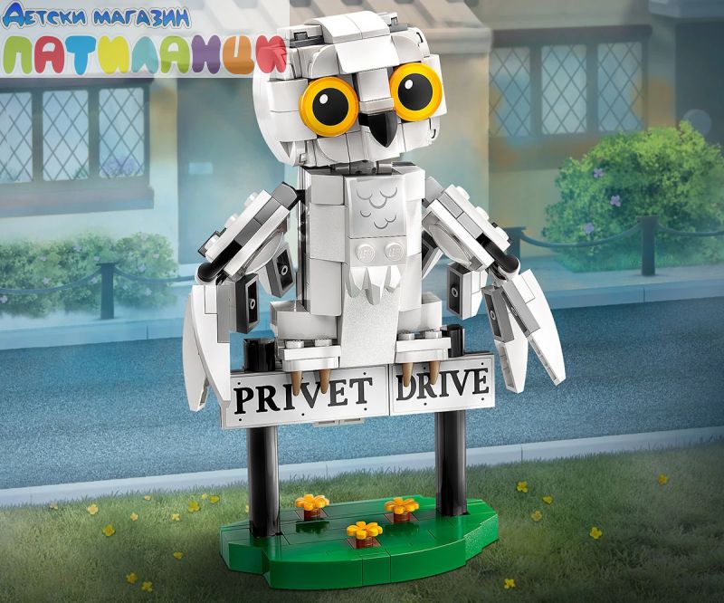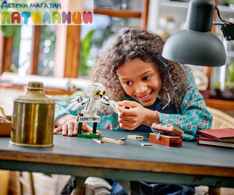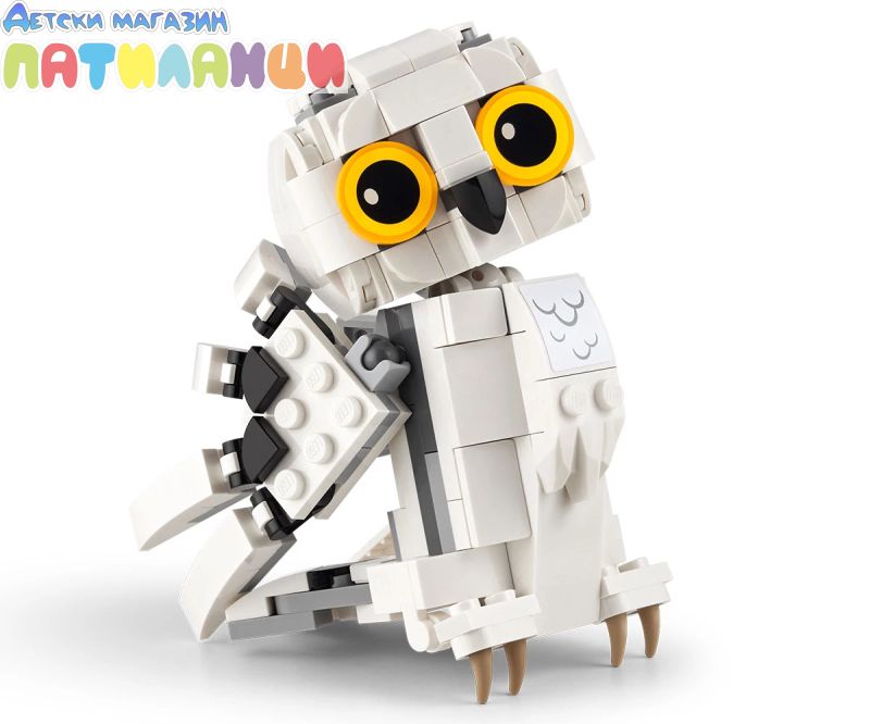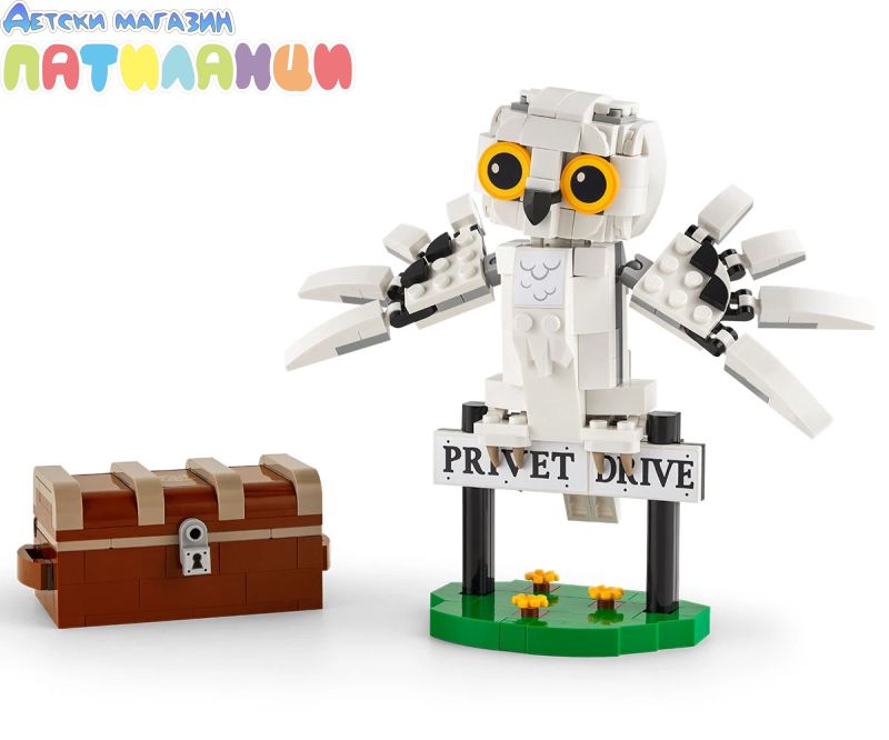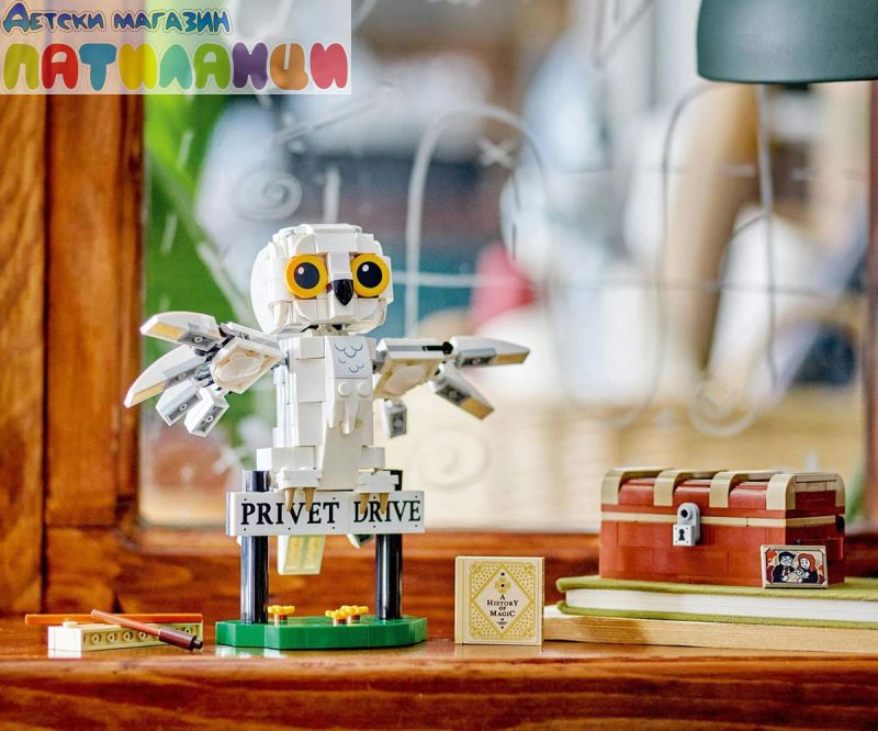 Постройте, изложете на показ и играйте със собствен очарователен модел на снежната сова Хедуиг! Пресъздайте външен вид на домашния любимец на Хари в стил LEGO® и позиционирайте главата, крилата и опашката ì за сладка поза. Качете Хедуиг на пътниязнак за „Привит драйв“, където Хари Потър е живял със семейство Дърсли. А какво ли има в огромния куфар на Хари? Портрет на Хари и неговите родители, книга История на магията и магическа пръчка!