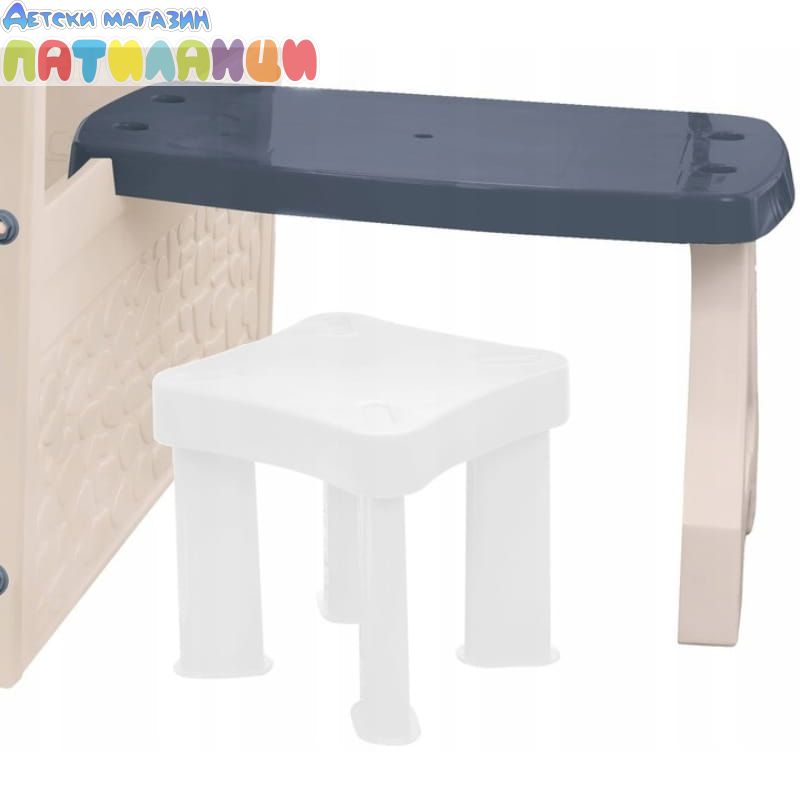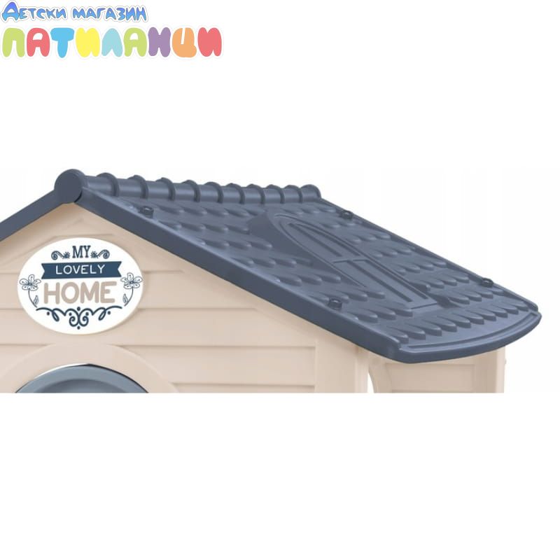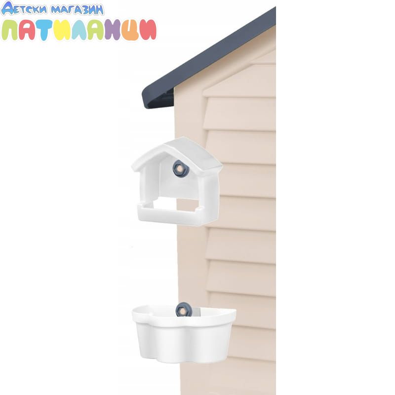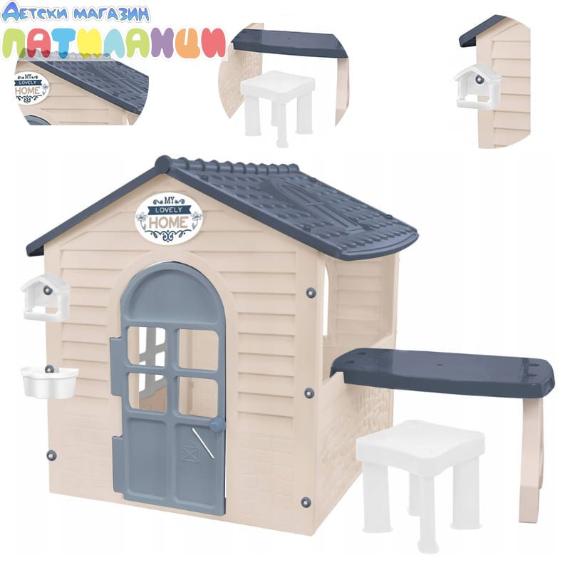 Забавна детска къща с маса и стол – перфектното място за игра! Вратата и прозорецът могат да се отварят и затварят, а комплектът включва маса, която се монтира на една от страните, столче и хранилка за птици. Изработена от безопасни материали и бои, къщичката е подходяща за деца над 12 месеца.