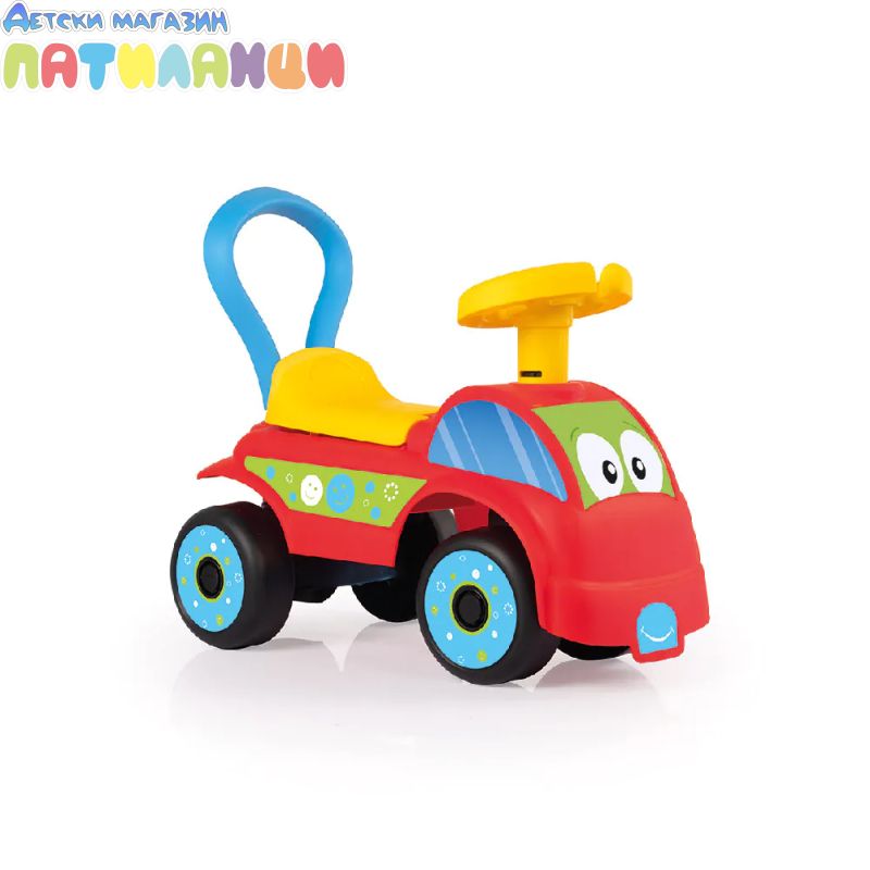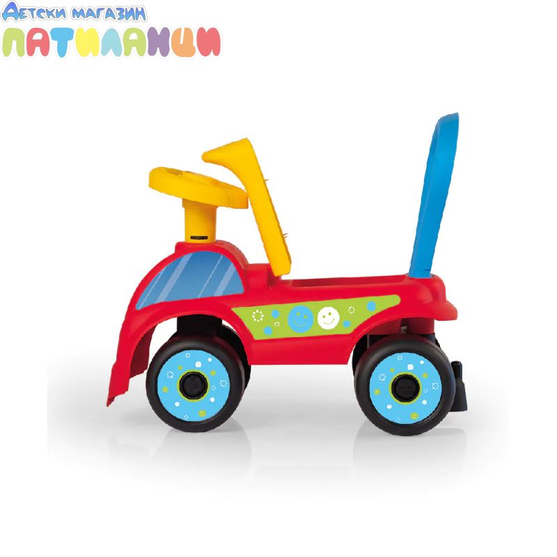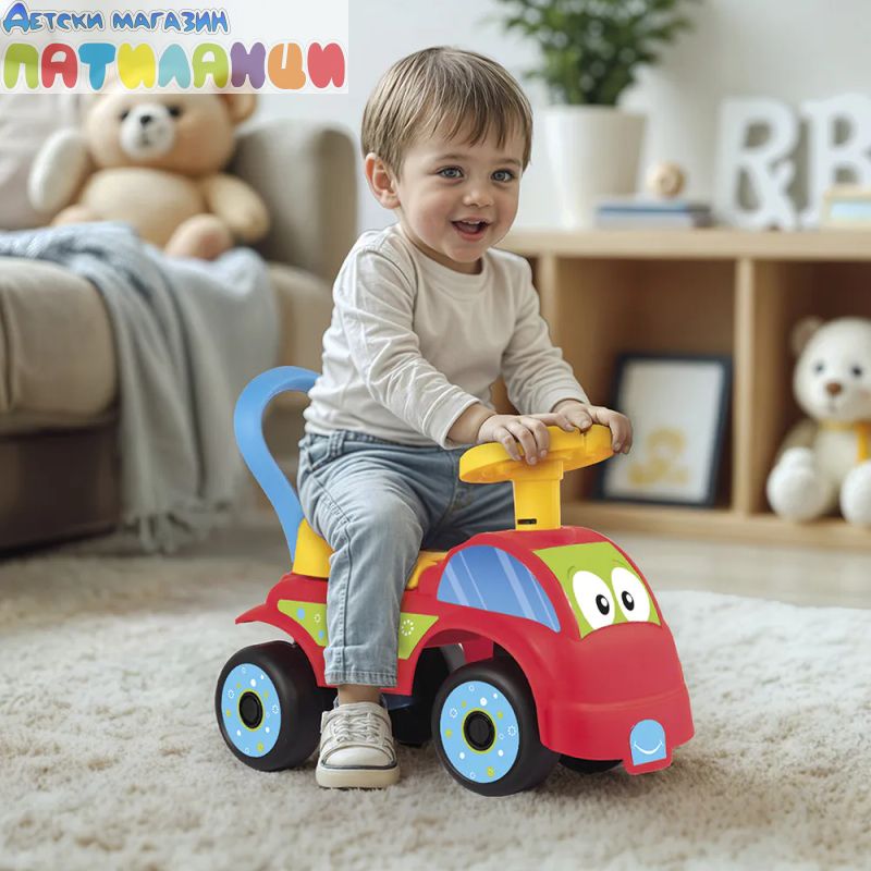 Тази кола за разходка и шофиране е идеална за забавна активна дейност. Просто се качи, ритай с краката си и потегляй! Повози се на удобната седалка или използвай дръжката на гърба, за да практикуваш ходене. Можеш дори да повдигнеш яркожълтата седалка, за да разкриеш място за съхранение за всичките си любими съкровища – какво ще вземеш на приключението си?