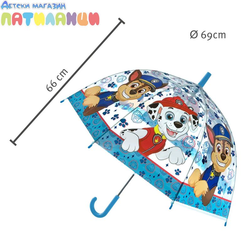 Чадърче Paw Patrol за малките приятели на сладките кученца, с диаметър 69 см. Чадърчето е с ръчно отваряне, обща дължина 66 см и заоблена дръжка за безопасно и удобно ползване.