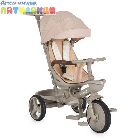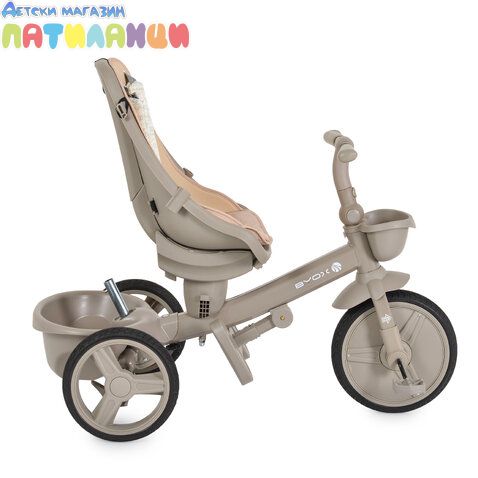 Мек предпазен борд, мека сваляема подложка на седалката, три-точкови предпазни колани, две задни спирачки и задна кошница за играчки.