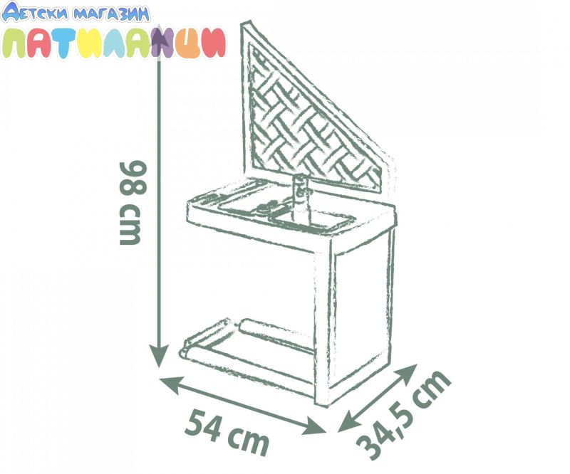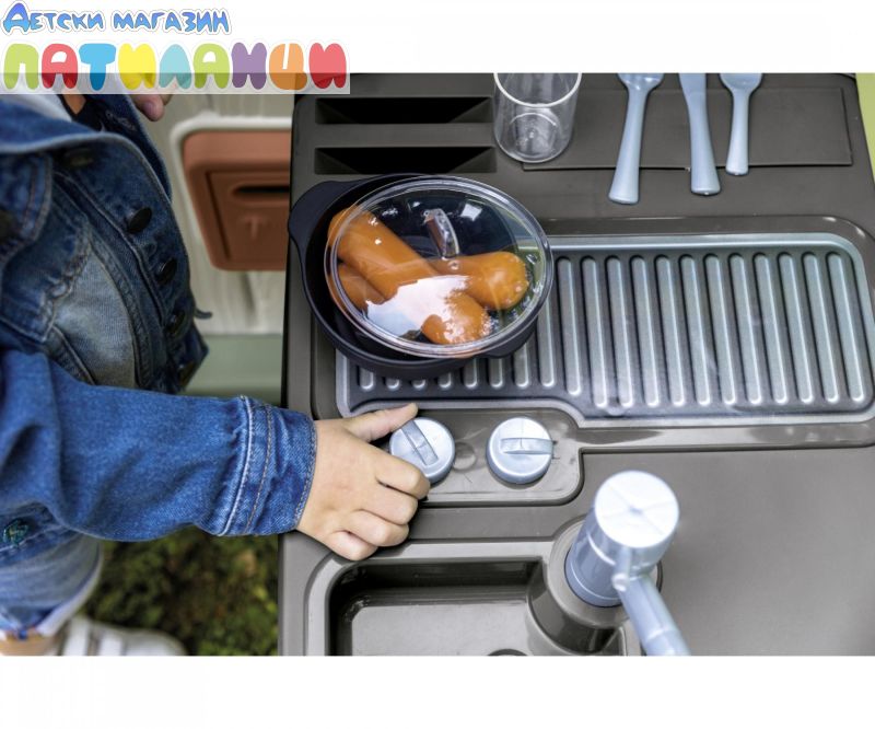 Състои се от 1 брой "скара" и 1 мивка с кран. Включени са 17 аксесоара, за да освежите функциите за игра: 2 чаши, 2 чинии, прибори за хранене, 1 тенджера, 2 колбаса, …