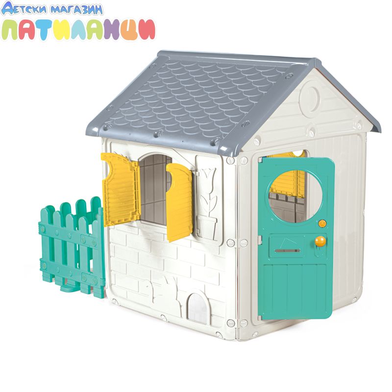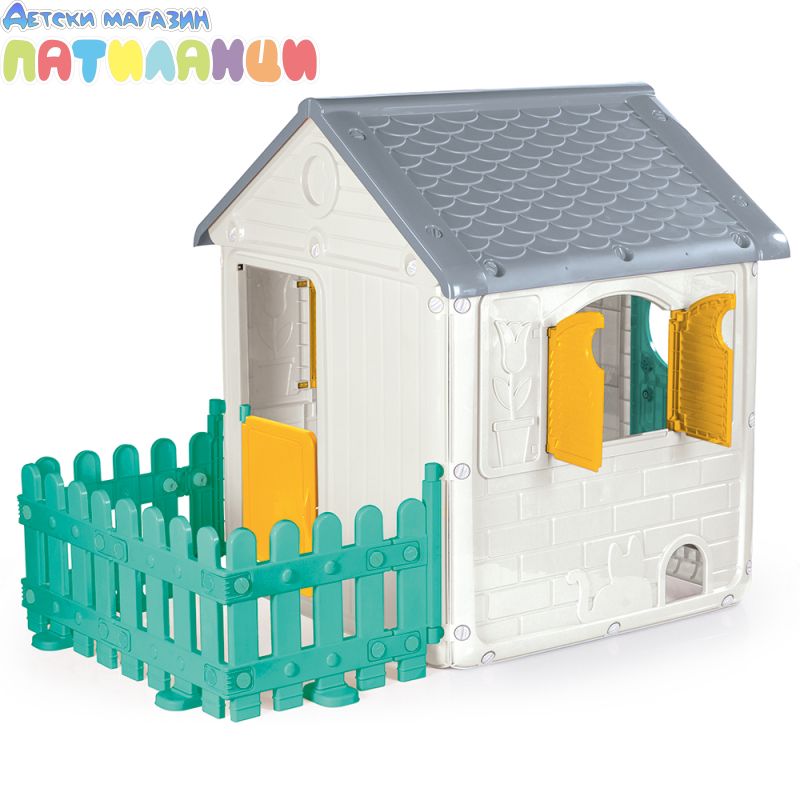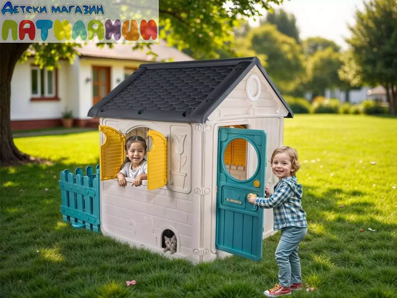 Просторна и пъстроцветна къща с ограда, подходяща за игра за две или три деца.