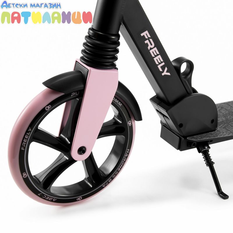 Тротинетката FREELY е оборудвана с усъвършенствани лагери ABEC-7 и големи PU колела с твърдост 87A и диаметър 20 см, осигуряващи изключително плавно каране и безпроблемно покриване на по-дълги разстояния с минимални усилия. Амортисьорите на предните колела предлагат допълнителен комфорт, като същевременно предпазват ставите на ездача от удари.