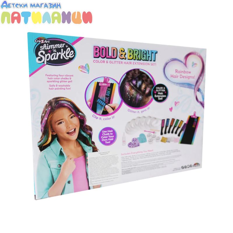 Комплектът включва: 6 гребена с оцветители за коса по 4,5 g всеки, брокатен гел за коса 15 ml, 2 пликчета с брокат х 1 g всяко, 2 пакетчета пайети х 1,5 g всяко, 6 бели удължителя за коса с клипс, дъска, клипс, 4 контейнерчета с капачета, четка, стик за смесване, листче декоративни камъчета за залепване към косата.