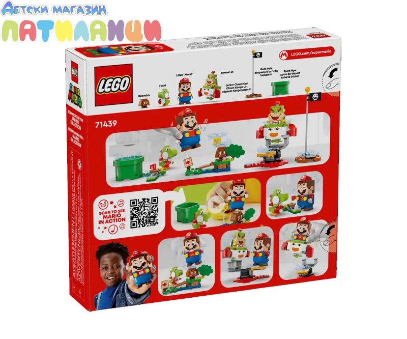 Дайте на децата часове приключения с интерактивния LEGO® Mario™, включително битка за Клоуномобила на Bowser Jr., с този комплект за игра LEGO® Super Mario™ (71439). Вълнуващ подарък Nintendo® за момчета, момичета и геймъри на възраст над 6 години, комплектът включва интерактивна фигура LEGO Mario, плюс Bowser Jr., фигури на Goomba и Yoshi, плюс 3 конструкции със сцени. Пътувайте от началната тръба до пилона за край на нивото, като предизвиквате цифровите реакции на LEGO Mario и събирате монети по пътя. Поздравете Yoshi, победете Goomba, скочете върху блока "?", свалете Bowser Jr. и след това отпътувайте в неговия клоуномобил. Ще намерите инструкции за построяване в кутията или в приложението LEGO Super Mario, което също така предлага творчески идеи за начини за конструиране и игра и е безопасна платформа, където децата могат да споделят своите творения. Разширете възможностите за игра, като добавите конструкциите и героите в този комплект към други в огромната гама LEGO Super Mario.