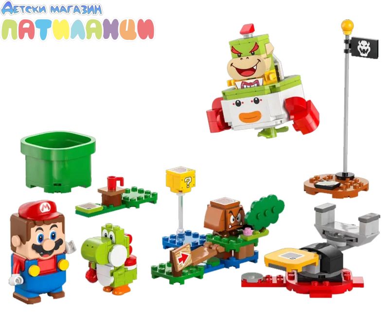Обединете се с LEGO® Mario™ за интерактивно приключение за събиране на монети! Започнете от началната тръба и поздравете Yoshi. Победете Goomba и скочете върху блока "?", а след това се изправете срещу Bowser Jr. Съборете го от платформата и от неговия детски клоуномобил, а след това отпътувайте с колата към пилона за край на нивото!