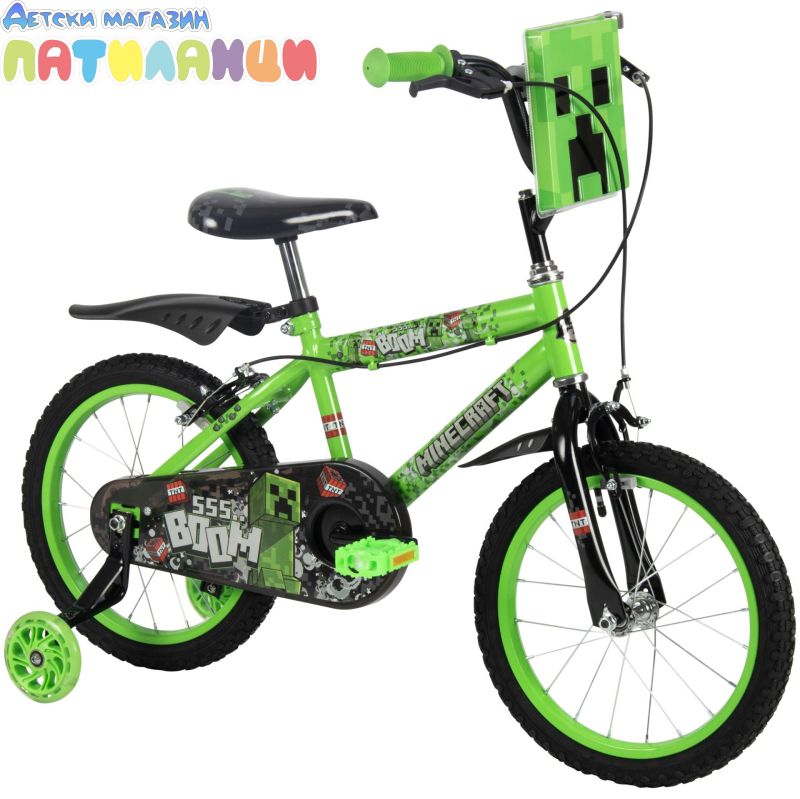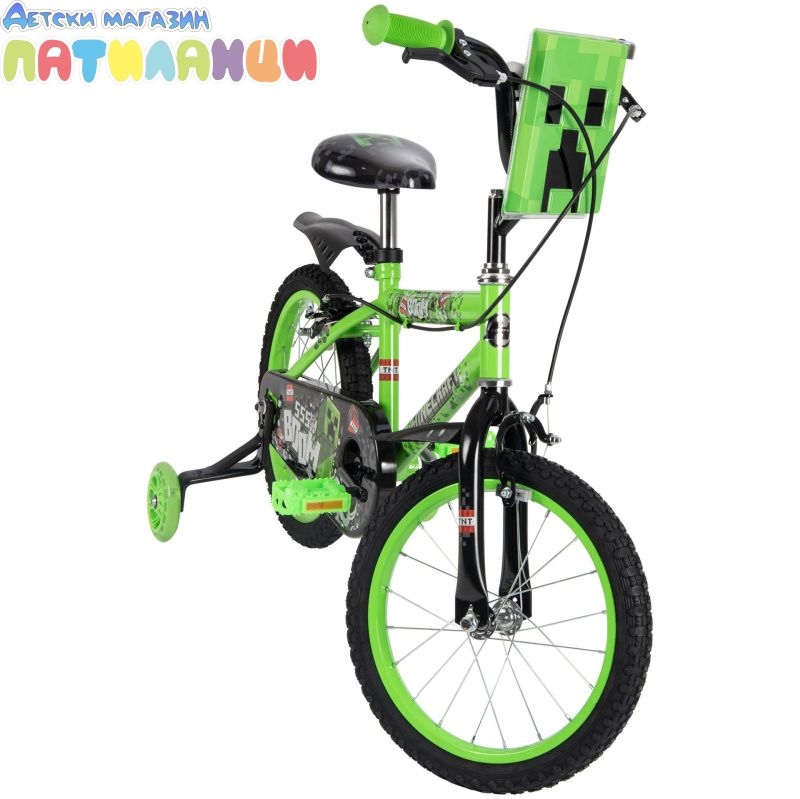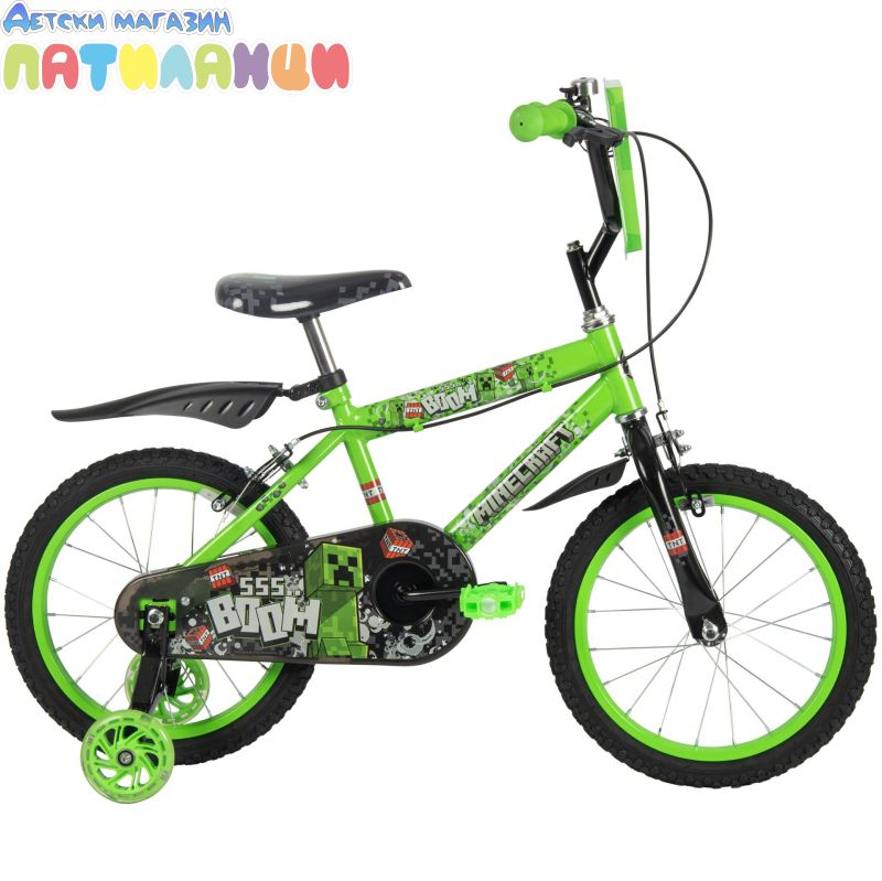 Със със светещи помощни колела за още по-голямо забавление! Този официално лицензиран велосипед се отличава със зашеметяващ черно-зелен пикселизиран дизайн и преден щит с Creeper на кормилото, идеално решение за всеки фен на Minecraft. Колелото е подходящо за деца на възраст от 5 до 7 години(112-127 см или тегло до 27 кг), разполага със здрава стоманена рамка, която ще издържи на всички ежедневни приключения.