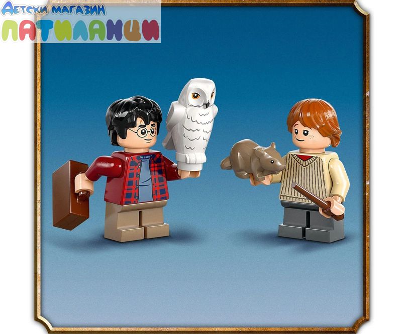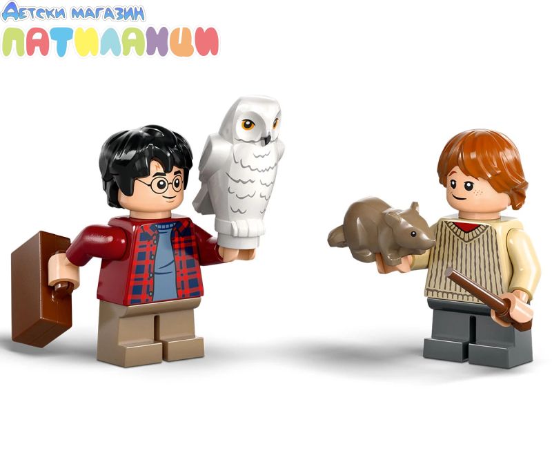 Комплект за игра и приключения с 4-ма герои от LEGO® Harry Potter™ – минифигурки на Хари Потър и Рон Уизли, фигури на Хедуиг и Скабърс, плюс куфар и 2 магически пръчки;