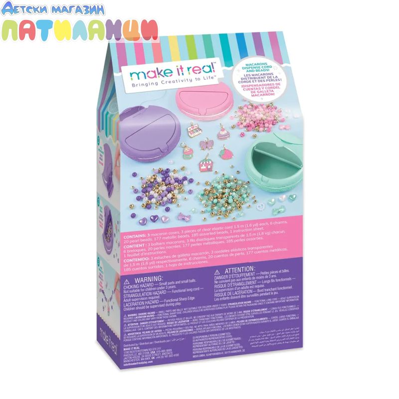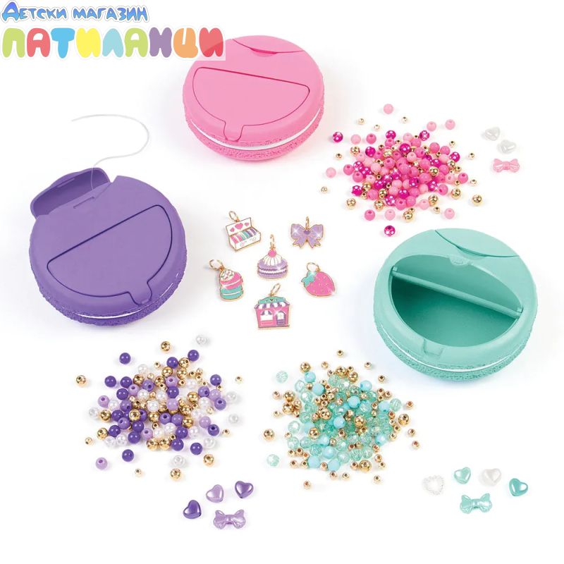 Комплектът съдържа: три кутийки с капачета тип "френски макарон", 20 перлени мъниста, 6 талисмана - висулки, 177 мъниста - металик, 185 цветни мъниста, 3 връзки ластична корда по 1,5 м всяка.