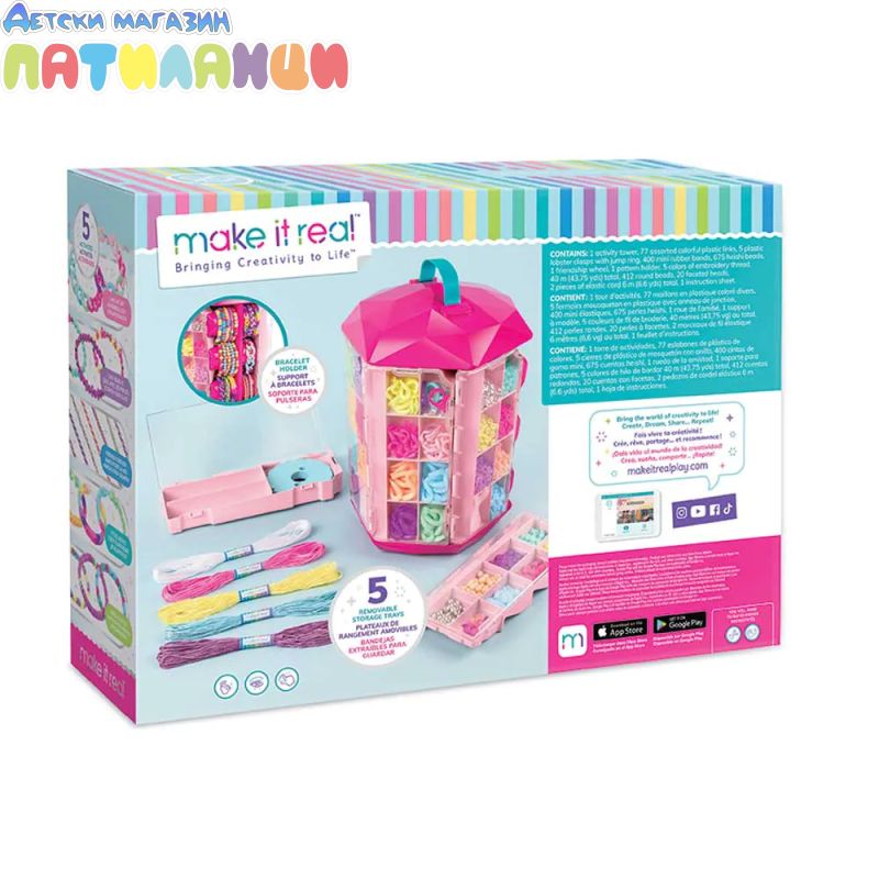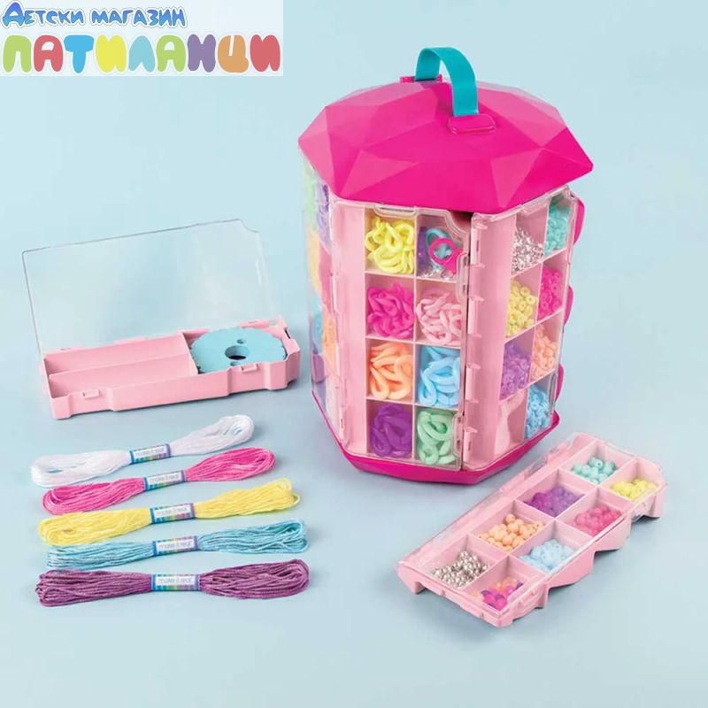 Комплектът съдържа: органайзер - кула, 77 пластмасови елемента, 5 закопчалки, 400 миниластичета, 675 мъниста, държач и кръгъл инструмент за плетене, конци 5 цв. общо 40 м, 20 фасетирани мъниста, корда 6 м.
